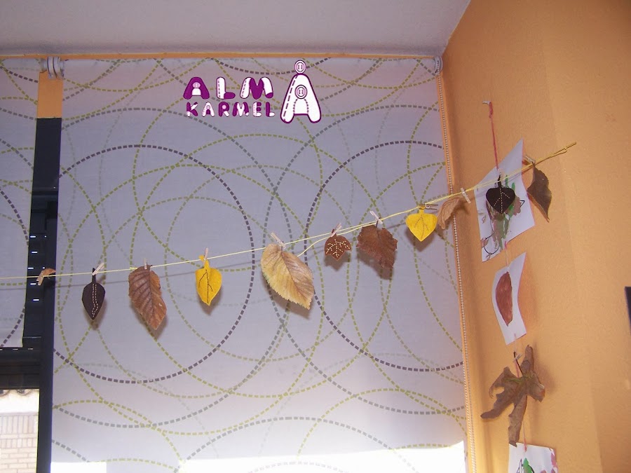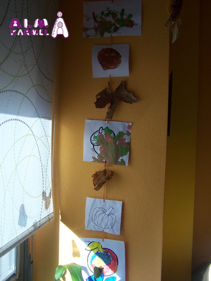 Tras dejar que se secaran, algunos los recorté un poco, cogimos una lana y los colocamos todos, así como unas cuantas hojas que cogió María el viernes de vuelta a casa desde el cole, porque las quería poner en el salón. Las pusimos en dos tiras y las colocamos en la pared, junto a la otra guirnalda que ya teníamos puesta de hojas hechas en fieltro y las recogidas de los árboles.