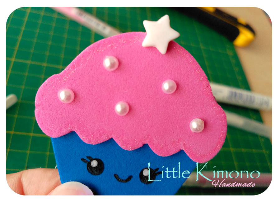y para el cup cake lo mismo, corte las plantillas sobre la goma eva, pegué y pinté, además coloqué unas perlas de scarp para decorarlo.