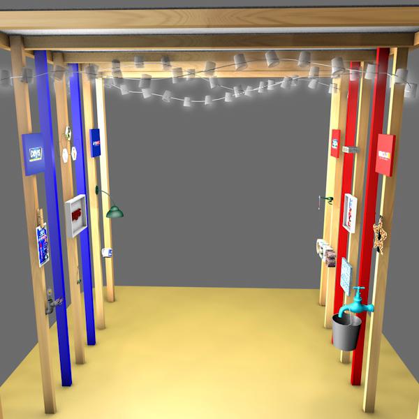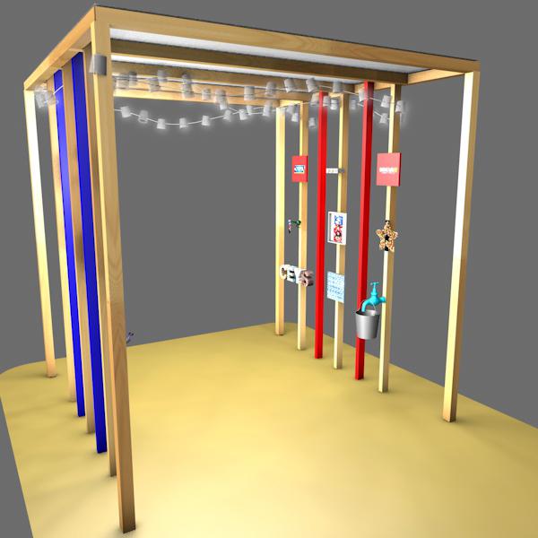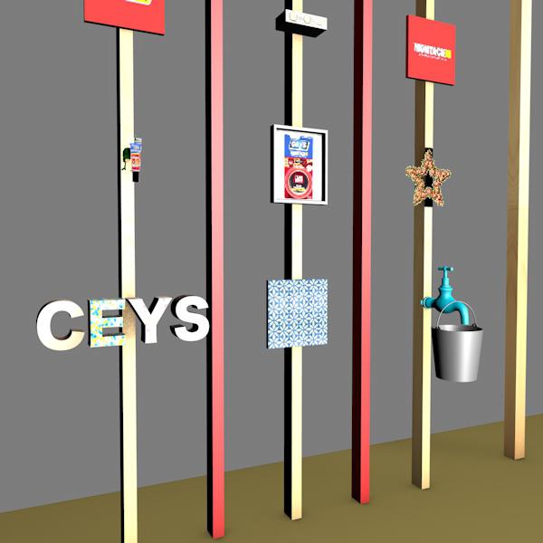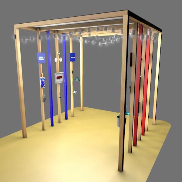 Por otro lado, también se nos proponía crear la iluminación del stand y nuestra idea nació rápidamente: una guirnalda. Además de que el box va a estar ubicado en un “festival”, estas luces son muy agradables y se usan mucho en la decoración de fiestas, pensamos que las guirnaldas aportan una luz cálida y difusa que proporcionan sensación de bienestar. Para nuestra guirnalda hemos pensado que la marca también ha de estar presente en ella, por lo que la guirnalda está creada con luces led y con botes de Ceys Superunik Pincel y tapones de Montack Transparente ya que a través de ambos puede pasar la luz al mismo tiempo que hacemos que los productos formen parte de otro de los elementos del stand.