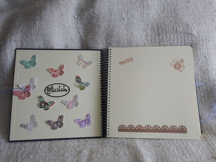 A la contraportada hi vaig troquelar amb la BIG SHOT felicitats i el vaig omplir de les famoses papallones de la MARTHA STWEART.