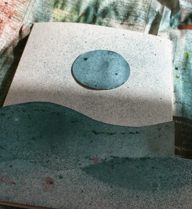 Posicionamos las formas recortadas y rociamos con la tinta en spray azul oscuro. Podemos ir variando la posición de las ondas que nos darán después las "colinas" del paisaje. Dejamos secar y sellamos árboles o los dibujamos.