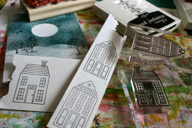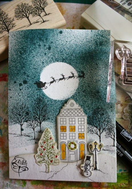Lo interesante de las casitas es que sólo estan en líneas, con lo que puedo colorearlas como desee. En este caso sólo he usado el amarillo para "iluminar" algunas ventanas. Ahora pegamos la casita y adornamos como queramos. Yo he usado algunos aditamentos que vienen también en mi set de sellos de las casitas.