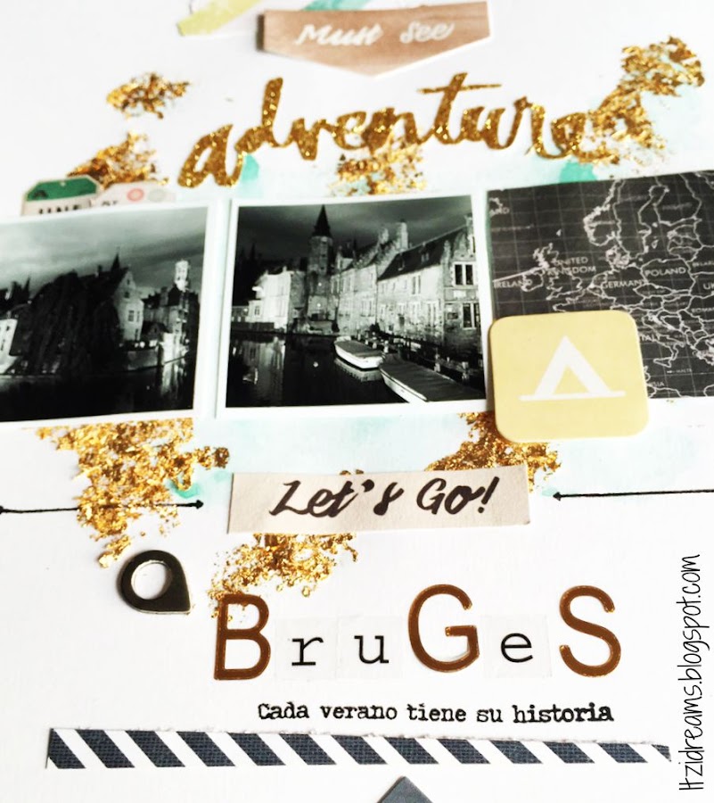 Yo me he decantado por crear un fondo con acuarelas y un toque de pan de oro, me encanta el efecto que le da a LO. He escogido estas fotos porque de todos los lugares donde he estado, Brujas me ha robado el corazón.