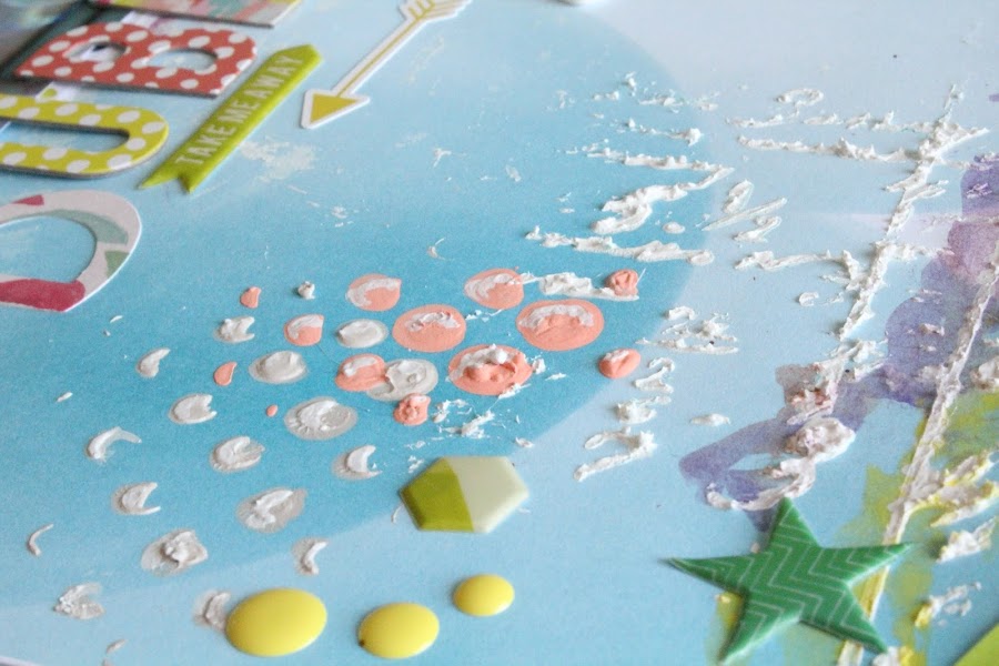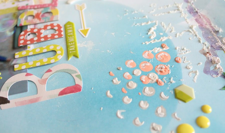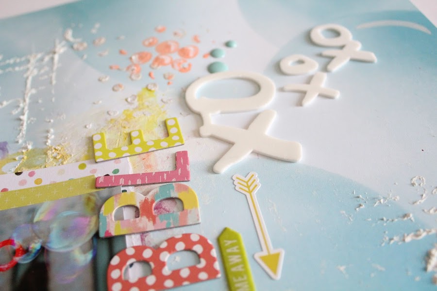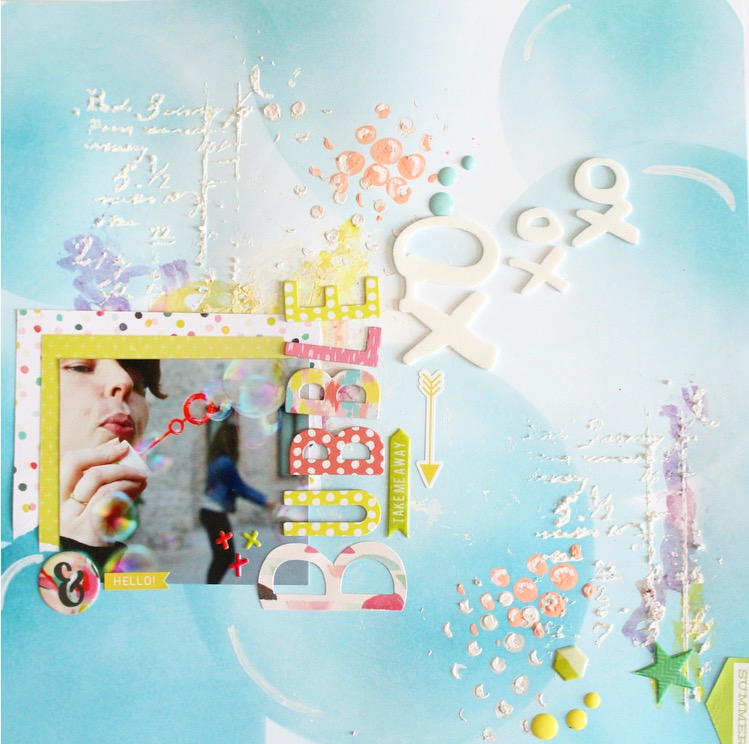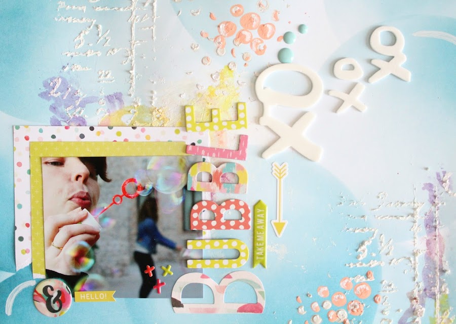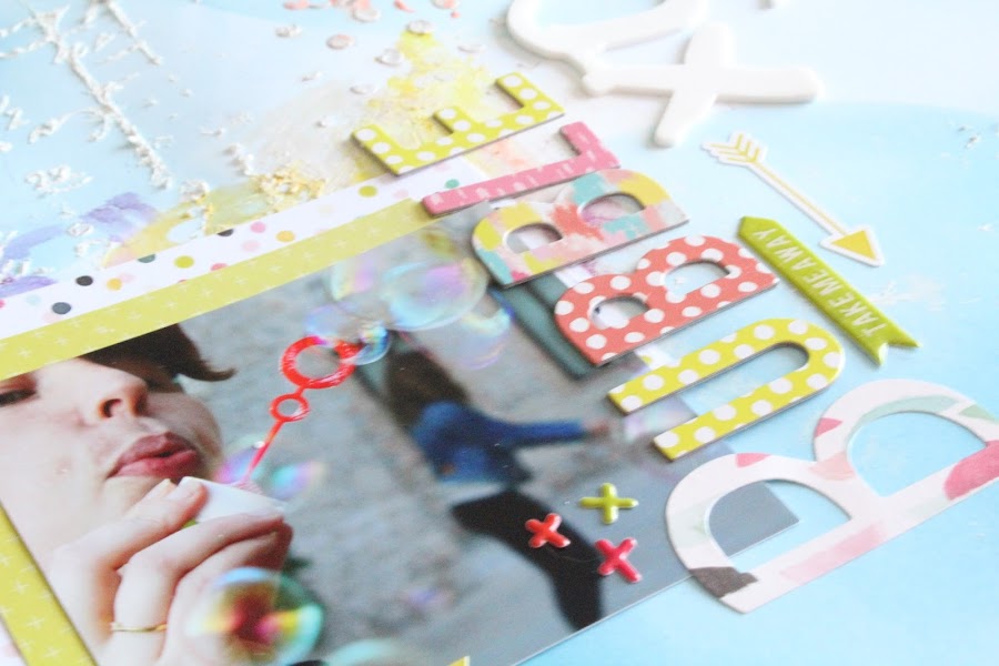 El fondo de burbujas azules me venia perfecto para complementar la fotografía es de Webter s Pages de la colección Make a Wish, los detalles del LO he usado el abecedario y stikers de la nueva colección Fancy Free, Paige Evans de Pink Paislee. Le aporta ese toque de color y frescura.