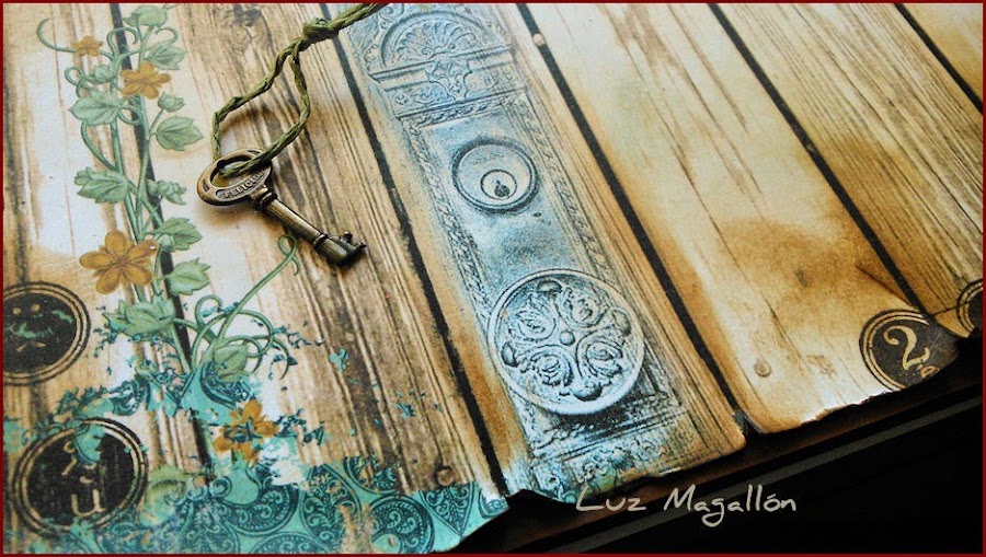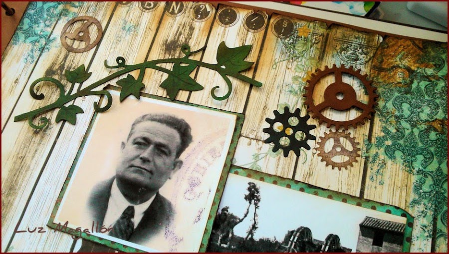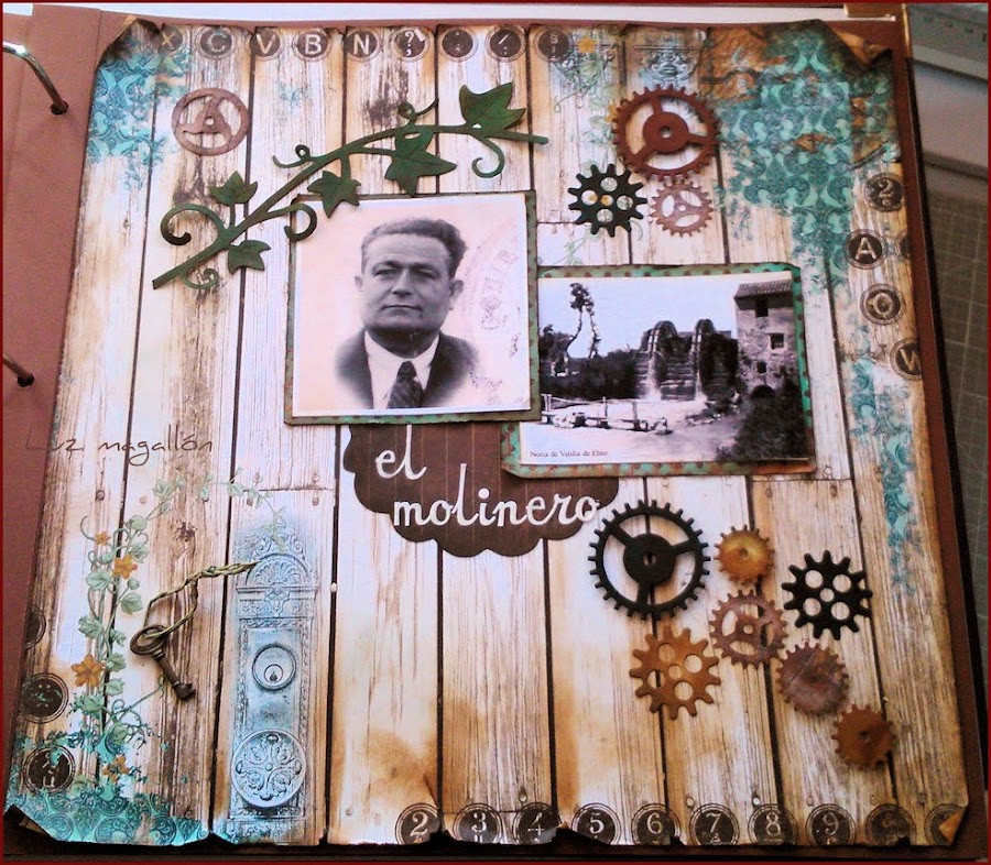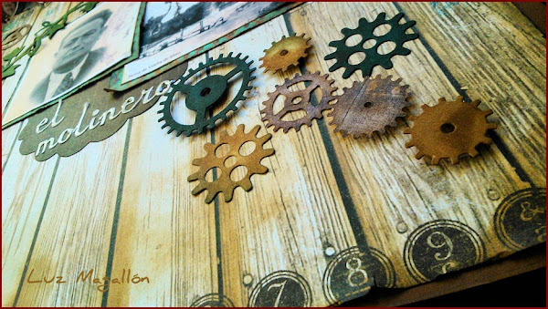 Para realizarlo utilicé papeles de la colección "Somewhere in Time" de BoBunny de la cual, este en concreto me encantó ya que lo vi muy apropiado para que con un simple vistazo se identificara con la puerta de un antiguo molino harinero de las orillas del Ebro.Rompí y envejecí todas y cada una de las puntas de los listones de madera y añadí engranajes muy propios de las muelas, norias y demás maquinaria en este tipo de edificios, los molinos.