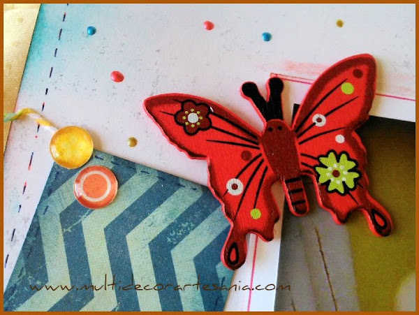 Una mariposa y mariquitas en madera pintadas van danzando por el cordel así como enamels dots grandes y pequeños de fabricación propia.