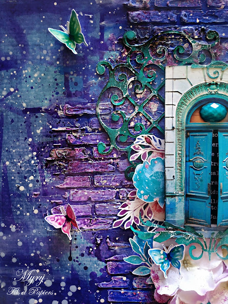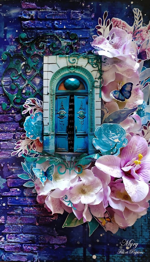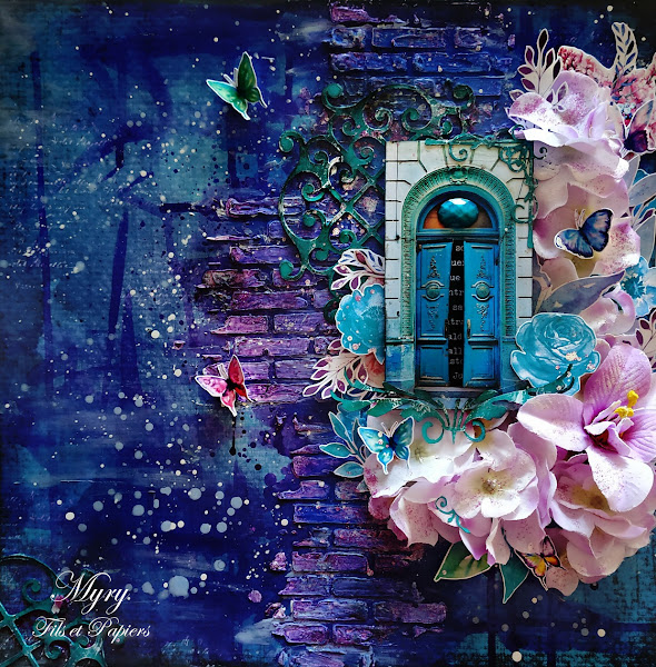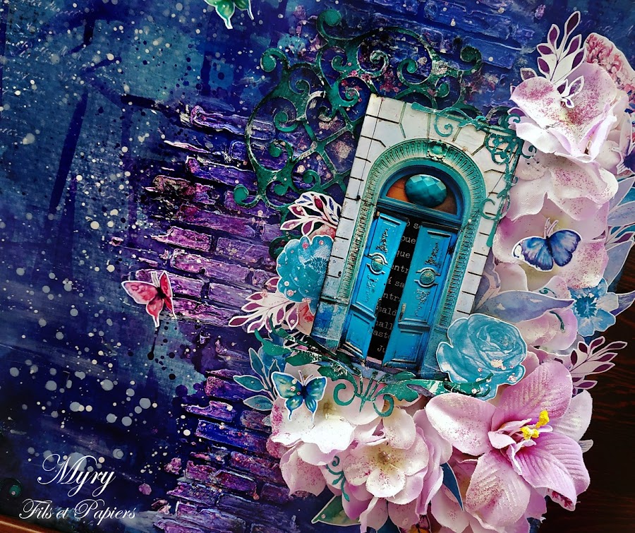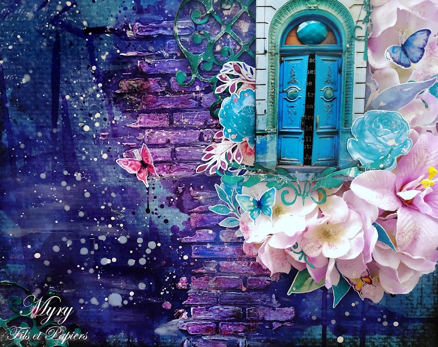 I chose a dark blue paper as a base which I decorated with gesso and a brick stencil.
