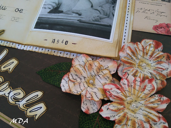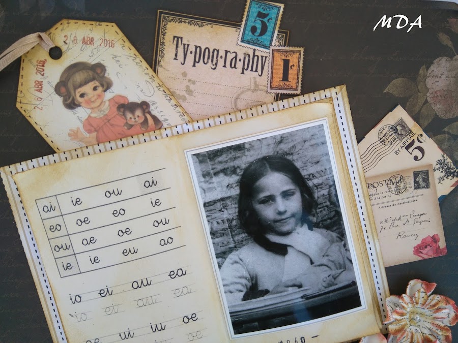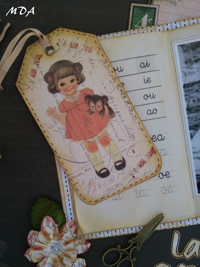 La decoración la componen una bonitas flores de papel con escritura de la marca Prima, sobres vintage y dos tags, uno de la colección Typography de Graphic 45 y otro que he realizado con una bonita muñeca de la época de la foto donde va la fecha en que he hecho el proyecto.