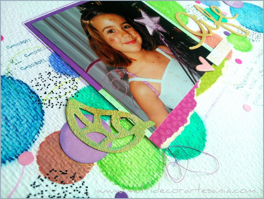 Primero hice un stencil en acetato con círculos de diferentes tamaños y con él fui pintando con pasteles una franja en el centro de la página. En realidad scraplifeé uno de los modelos propuestos para su reto de enero en Locas por el Scrap, concretamente uno de Missy Whidden que scraplifeo Olga del DT.