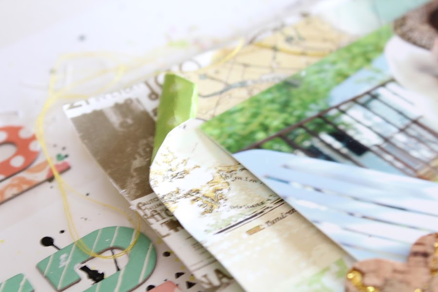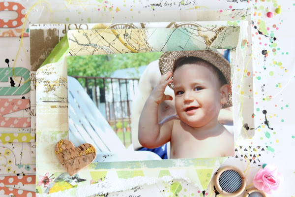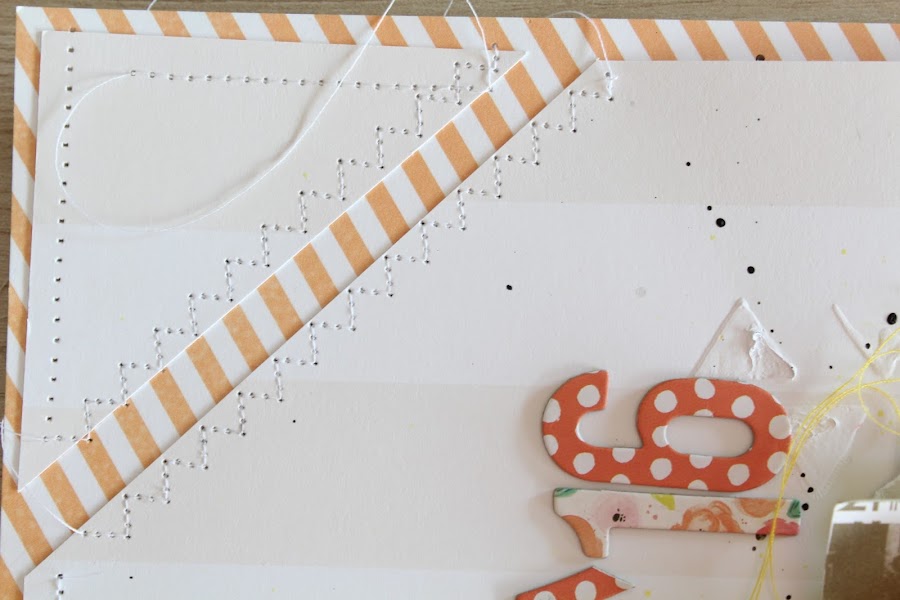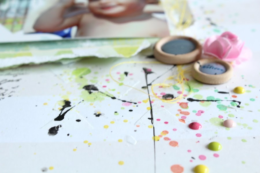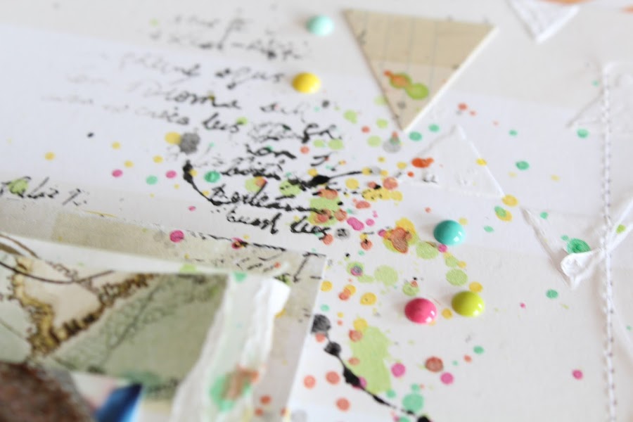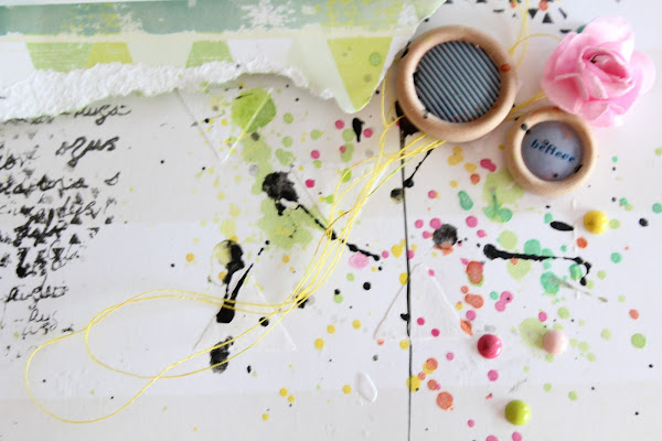Las técnicas que he usado son una mezcla que entre si dan esa sensación de relieve y textura. El cosido que a demás de aportar firmeza al proyecto le da ese toque majestuoso. Dar relieve con gesso y stencil dando esos pequeños elementos que ayudan a complementar el LO. Con las acuarelas he usado la técnica de la salpicadura dando pequeños oques de color que con los Enamels Dots cobran vida. Salpicaduras de tinta negra junto con los sellos para darle textura al proyecto.