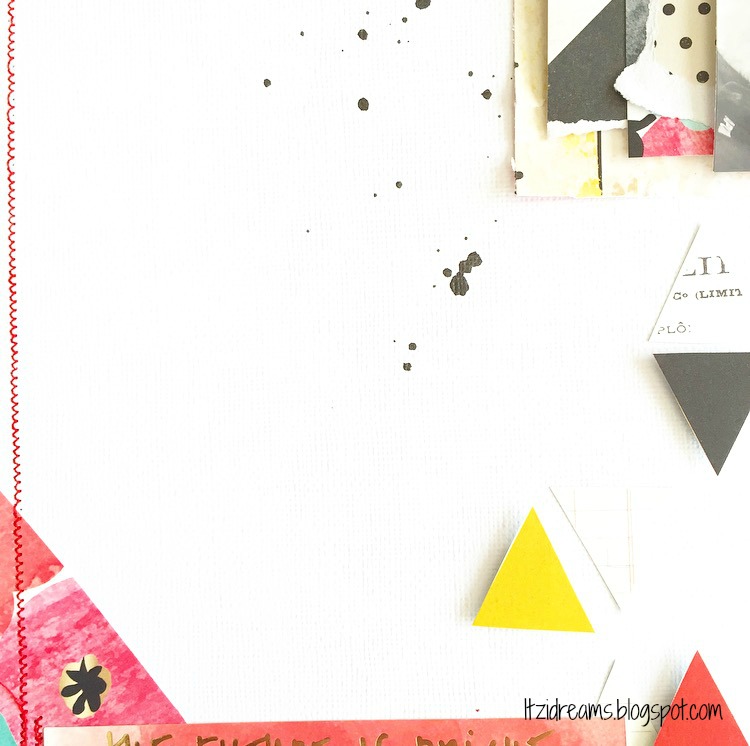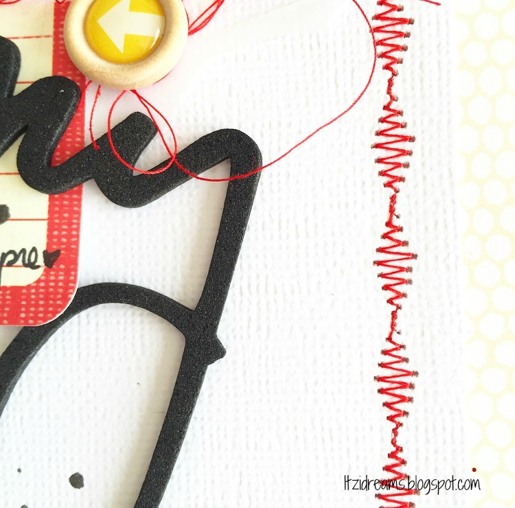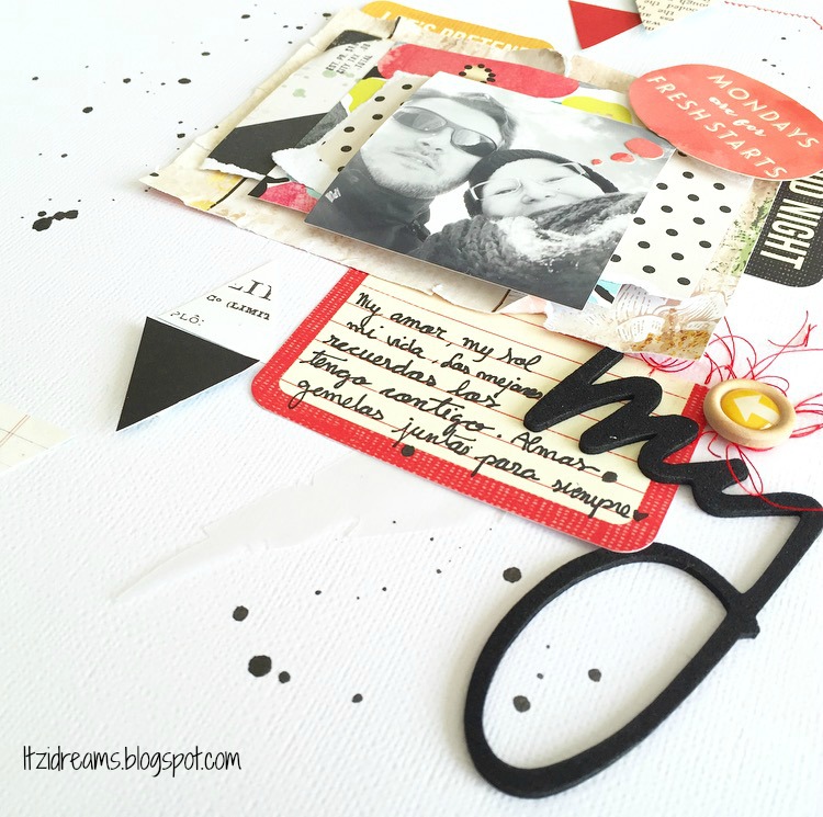 Para dar contracte usé diferentes colecciones de papeles: Shimelle, Grady. Dear Leazzy Documentari, Fancy Fee (sin duda el que provoca más contracte), Los triángulos de la colección de papeles Pink Paislee, Memorandum en concreto: Memo. Rematé el detallé del LO cosiendo una filigrana roja alrededor enmarcando la composición.
