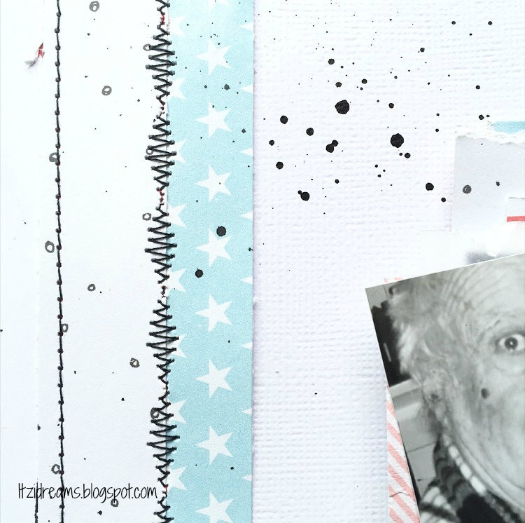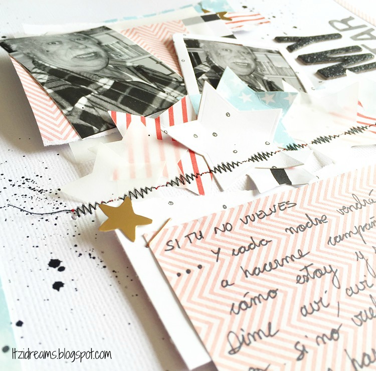 Para acompañar el titulo he puesto una cama de estrellas cosidas con una filigrana que recuerda el latido del corazón. He utilizado las mismas colecciones que los detalles de la página, siguiendo una concordancia, también he añadido unas estrellas de papel vegetal para atenuar un poco la intensidad del naranja. Para darle un punto de luz, he utilizado unas estrellas doradas de los Stickers de Dear Lizzy.