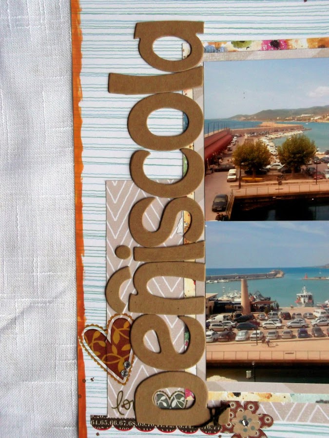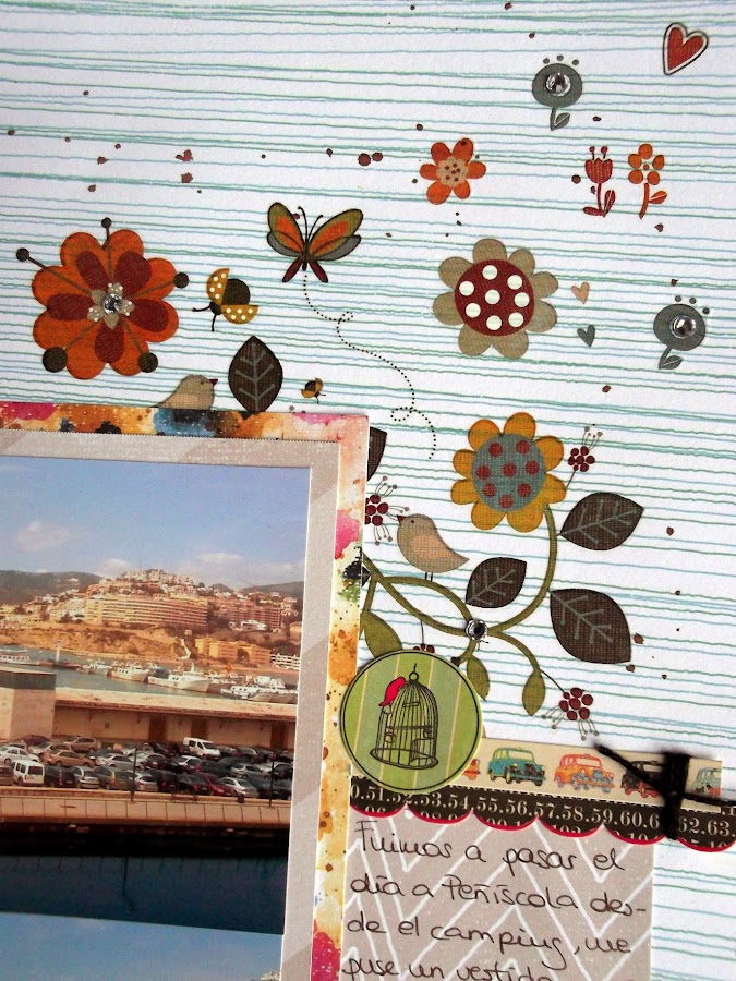 El papel del base es de la colección PRINTSHOP! de Studio Calico y el resto de papeles son recortes de la misma colección de LO"s anteriores. Todas las flores son rub ons de Basic Grey así que sí, primer reto conseguido. El segundo reto también está superado porque los bordes del papel está pintados con acuarelas.