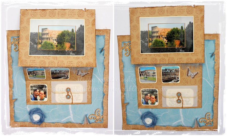 No he usado ni un solo papel de scrap, sólo cartulinas y con sellos y papeles, he dado color y texturas. Para el reto de CSI pedían que el LO incorporara los siguientes elementos:
