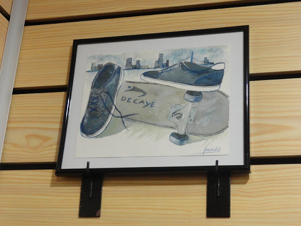 Salimos el sábado tempranito y nuestro primer destino fue Decaye. No conocíamos nada de Badajoz, y teníamos muchas ganas de conocer in situ la tienda que surgió del proyecto empresarial de mi cuñado. Lo que yo no sabía (o no recordaba, la verdad) es que mi hermana había pintado un cuadrito para el escaparate. Cuento con su medio aprobación para publicarlo pues dice que ella ni sabe pintar ni crear, pero no me digáis que para alguien que coge un pincel cada 10 años y que lo que dibuja en su cabeza, rarísima vez lo traspasa al papel, no está bien, pero que muy bien.