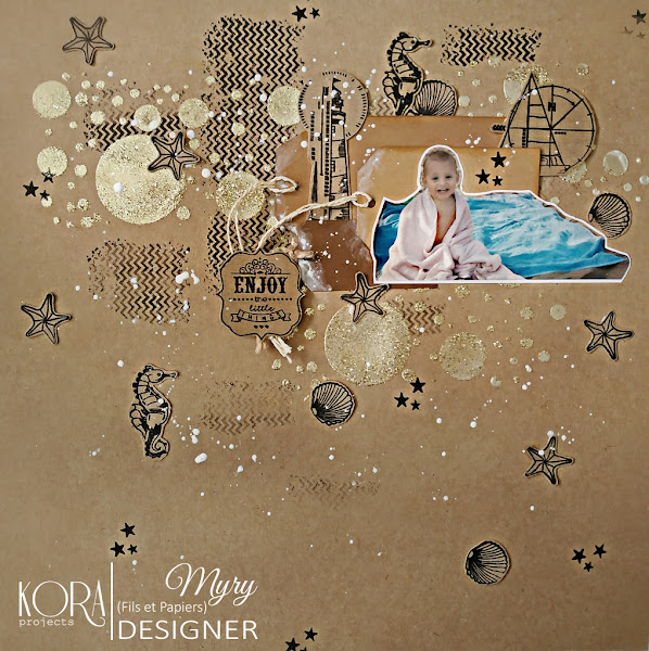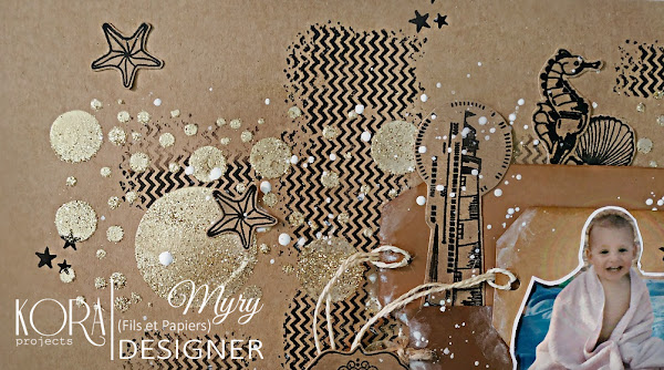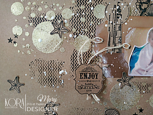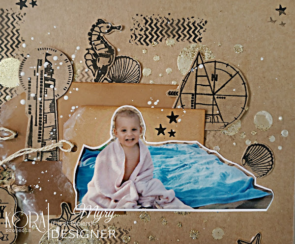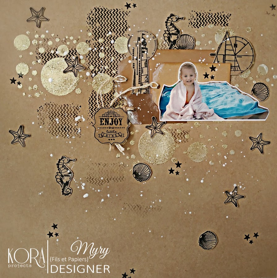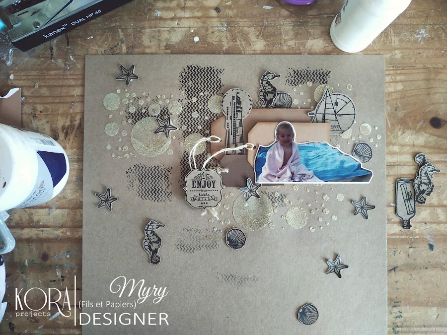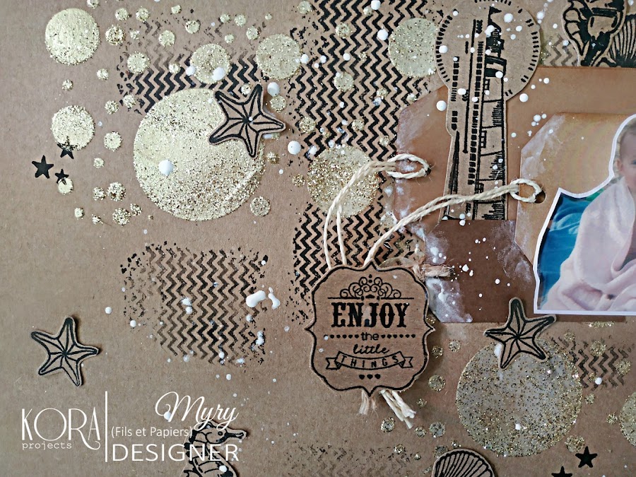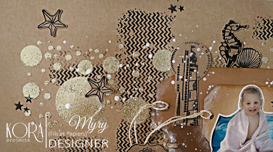I used very few materials including some stamps: nauticals from Kora Projects, with title and another from Kaiserkraft and stencil from Ab studio to make the background; cardstock kraft, white acrylic paint and golden glitter.