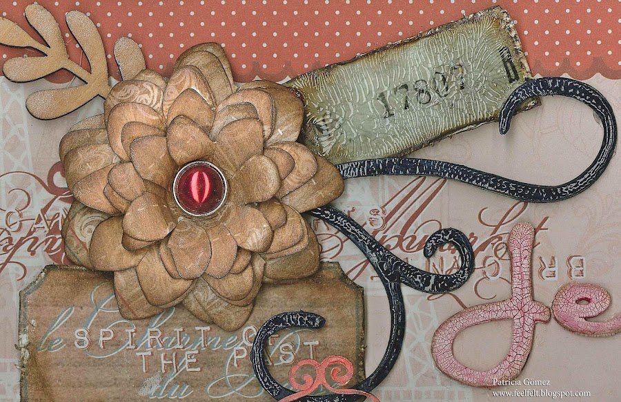 Troquelado de madera con glimmer mist, la flor hecha a mano con el troquel Spellbinders Daisy Heads.Tanto el arabesco como el ticket llevan Crackle Accents.