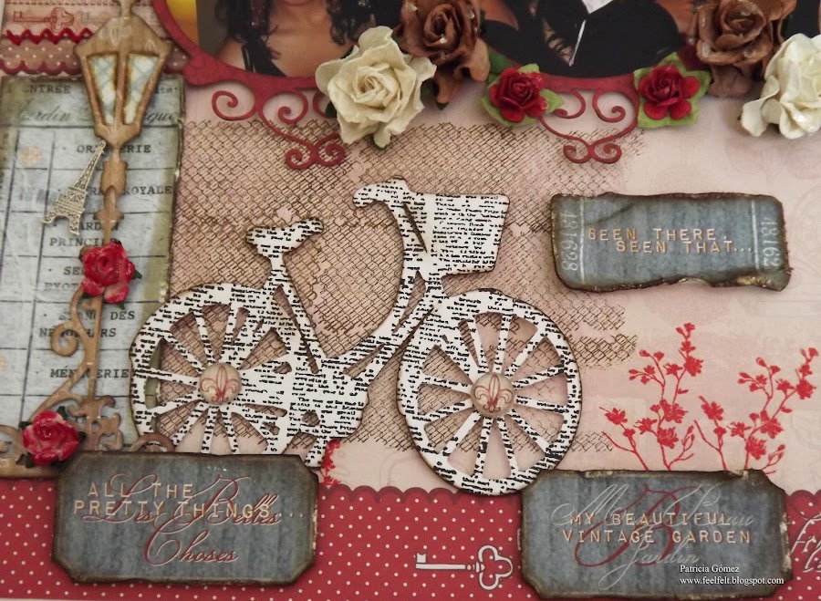 La bici es un recorte de la Cameo también. Lleva selledo sobre ella, sello de texto de Tattered Angels Heidi Swapp Rockin" Renaissance Tattered Textures.