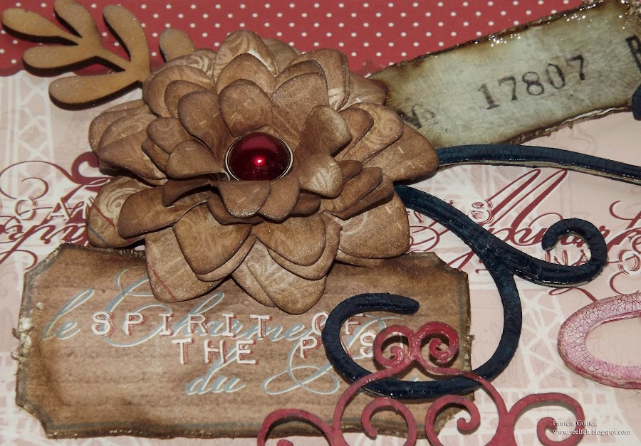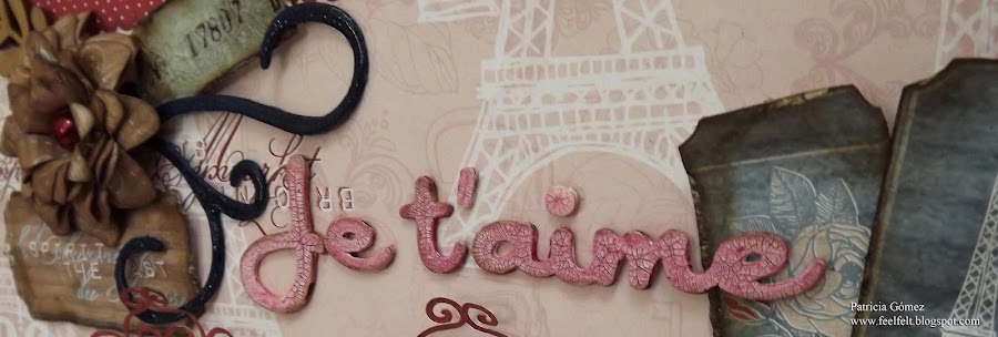 El texto Je t´aime está realizado con la técnica del falso chipboard, que podéis ver en la pagina de Teresa, pintado con Distress Crackle Paint Tattered Rose, y luego lleva acrílica roja, retirada, para que solo penetrase en el craquelado.