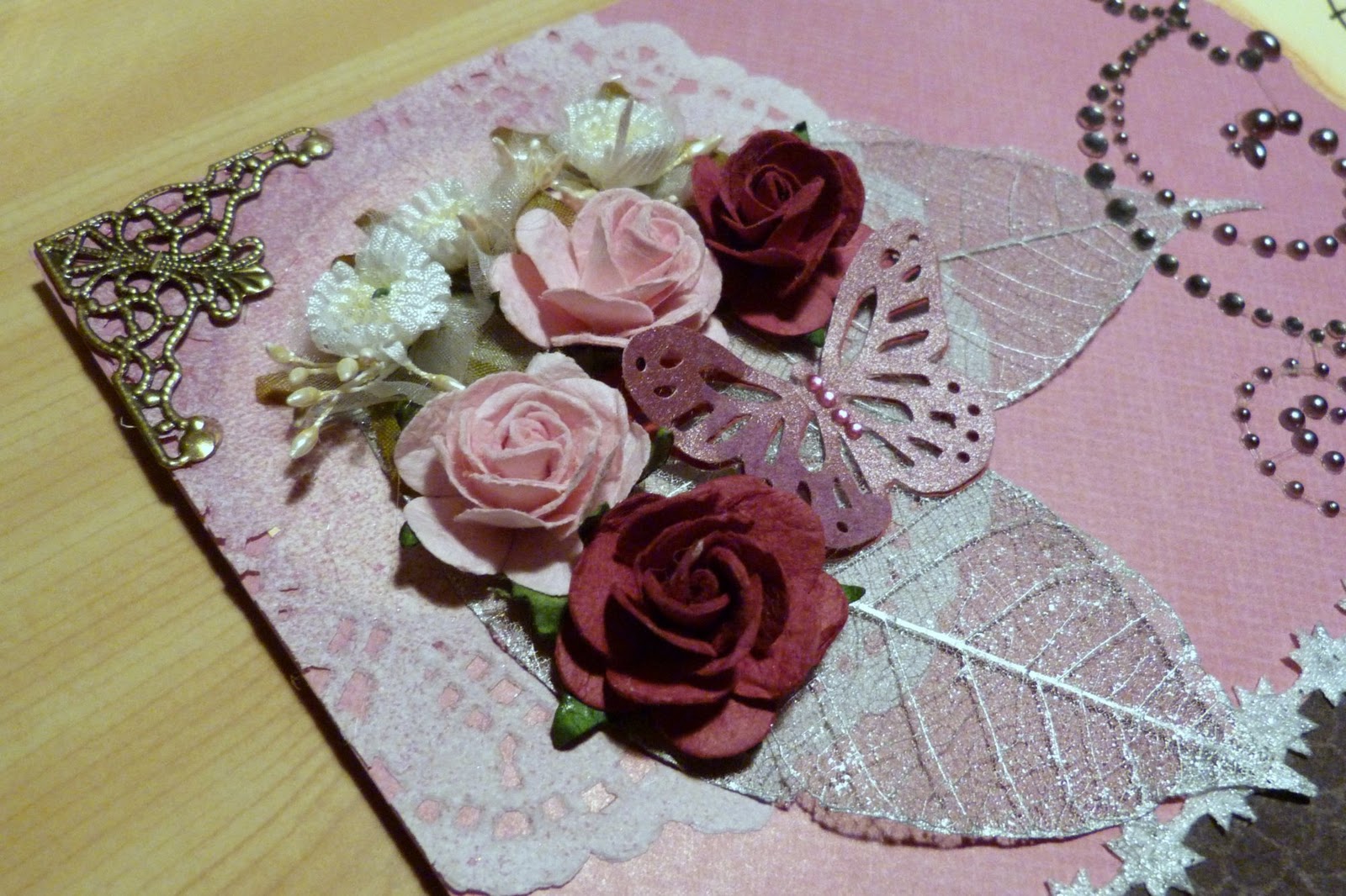 El ramillete con flores de tela y de papel con las hojas plateadas que tanto me gustan y un esquinero de metal.