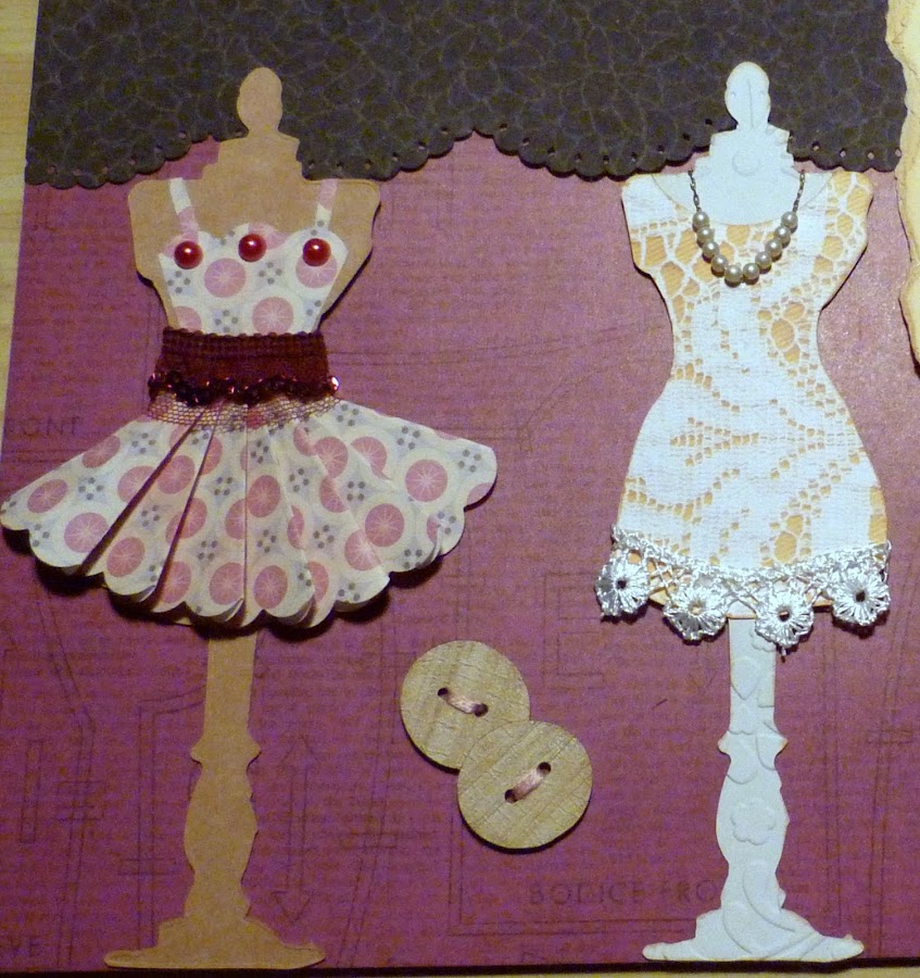 Un detalle de los vestidos, el de los volantes esta hecho con un troquel de scallops de Sizzix, un trozo de cinta a modo de cinturon y unas perlitas. El que imita blonda lleva un remate con cinta y un collar de perlas reciclando un collar de verdad mio que perdió una parte.