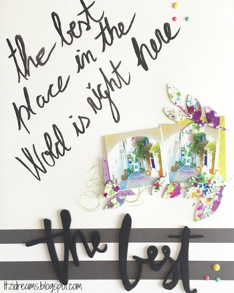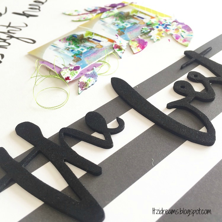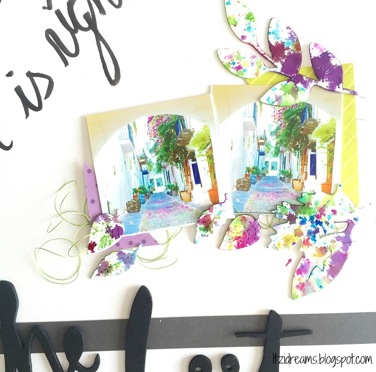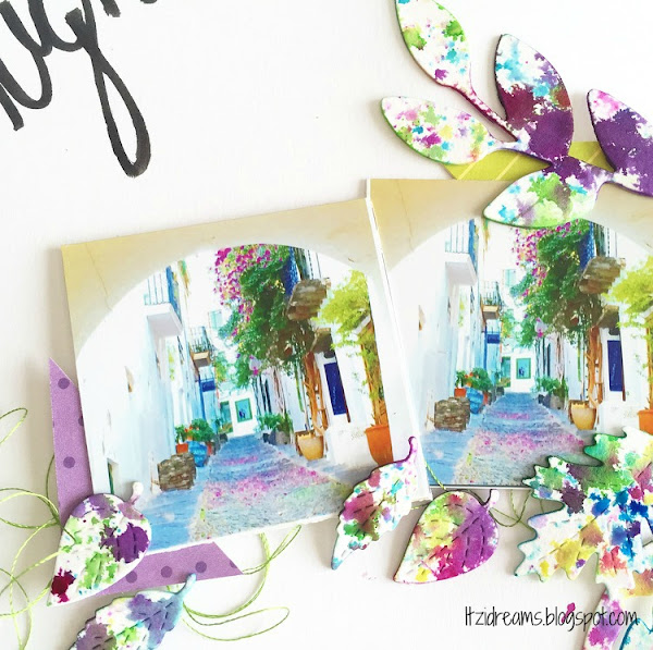 He combinado una selección de colores en unas bonitas hojas troqueladas, con un estampado de salpicaduras de acuarelas. Para el mensaje del Lay Out he usado una escritura a mano con tinta negra para darle ese toque desenfadado.