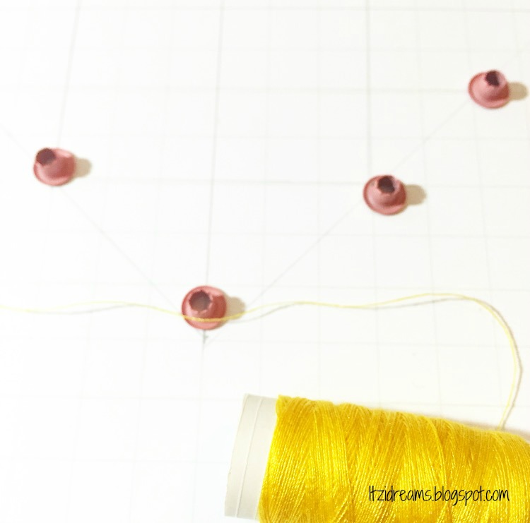 Voy por pasos: En primer lugar he dibujado la estructura geométrica con lápiz y regla, marcándonos los puntos principales de la estructura. En segundo lugar pegaremos un Eyelet al revés en los puntos marcados de la estructura, a modo de clavo, acto seguido borraremos las líneas en lápiz.