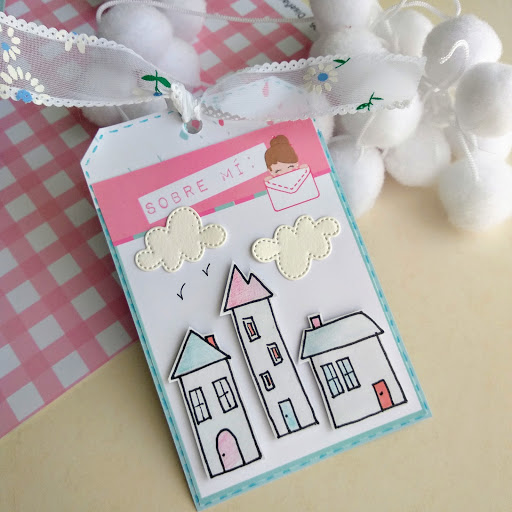 Para hacerlo, usé una de las tarjetas de la colección y le añadí unas casas que dibujé, pinté, recorté y pegué, además unas nubes que corté con un troquel de La pareja creativa.