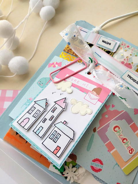 Al otro lado otro bosillo lleno de más chuches scrapperas y un tag (otro de los requisitos) con cinco cosas sobre mí: color, estilo scrap, herramienta, mañoscrapper y proyecto favorito.