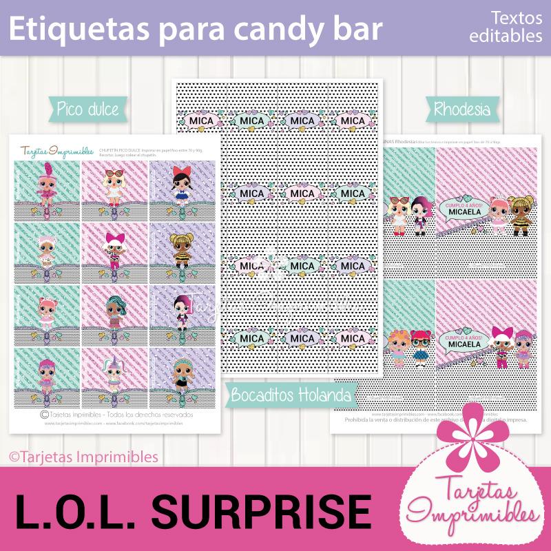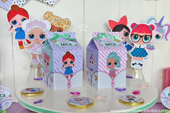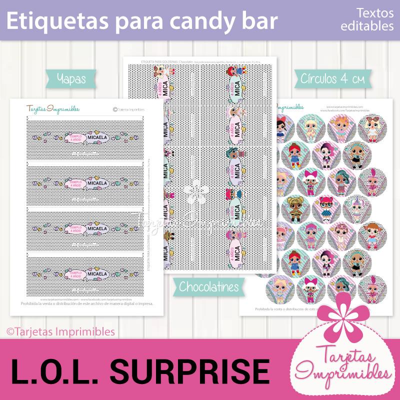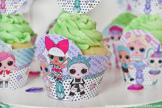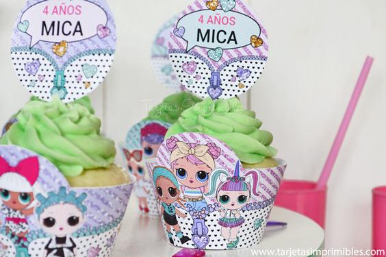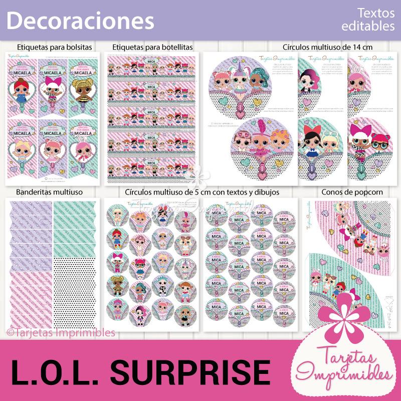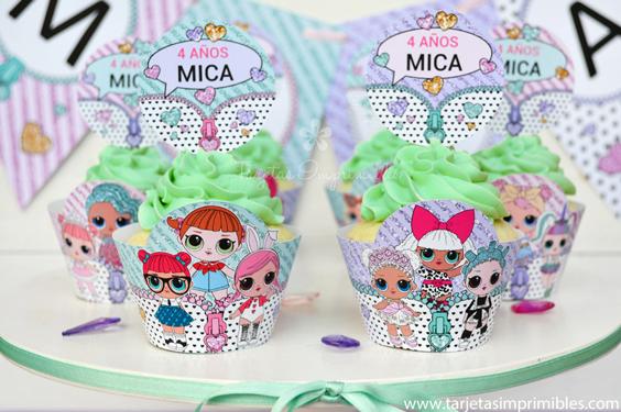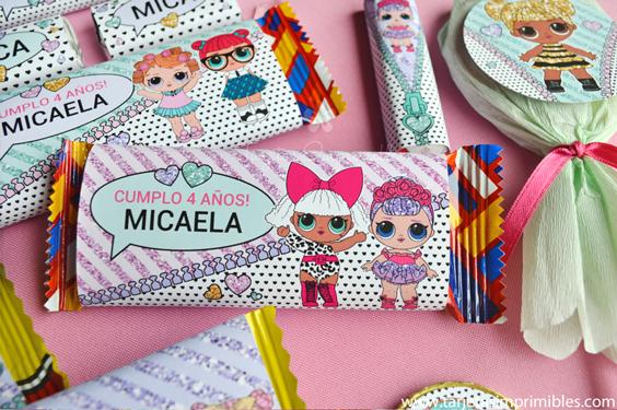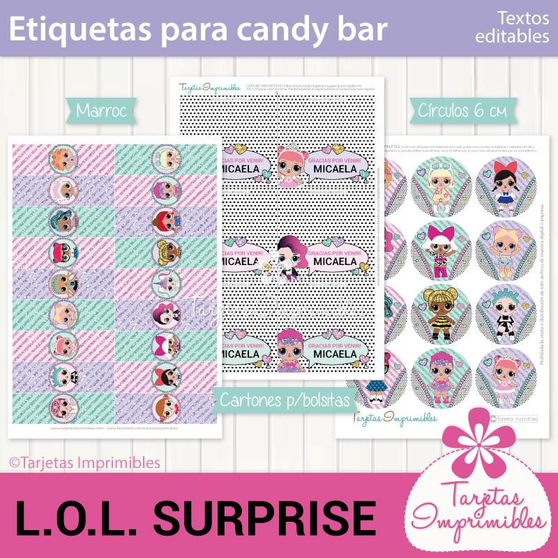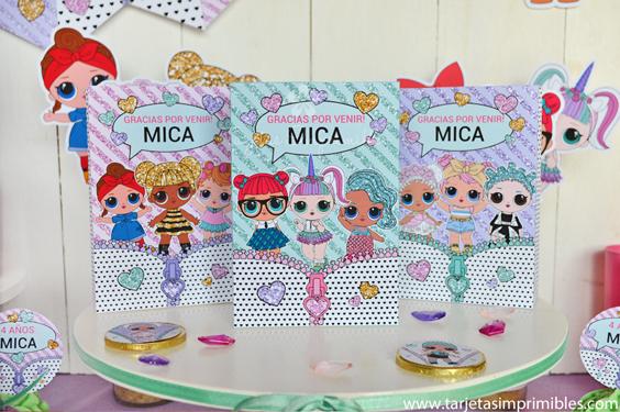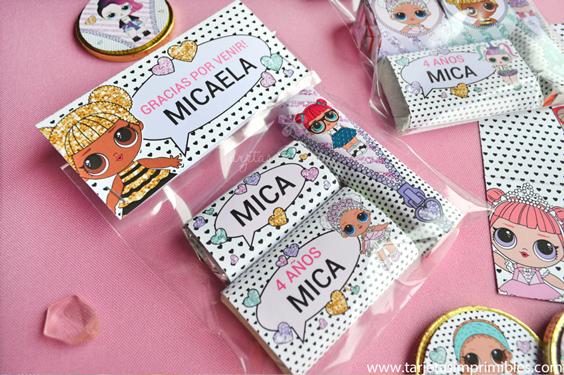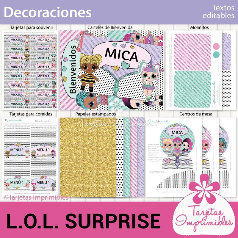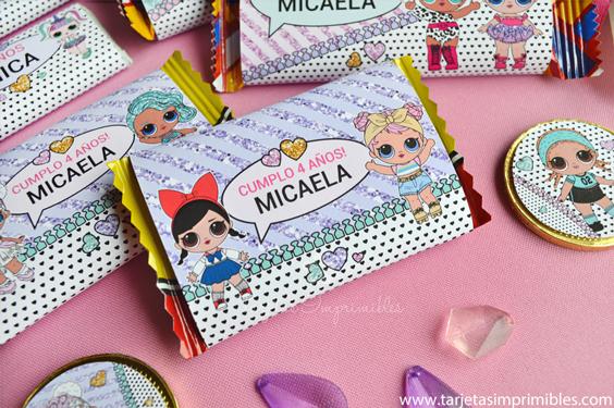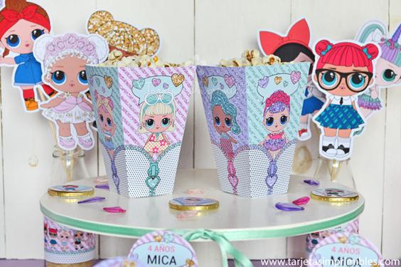 Como siempre vas a encontrar en Mi tienda online el Kit de decoraciones Lol Surprise, el Kit de etiquetas para candy bar, 3 modelos de invitaciones, wrappers para cupcakes y cajitas para regalar a los invitados.