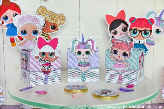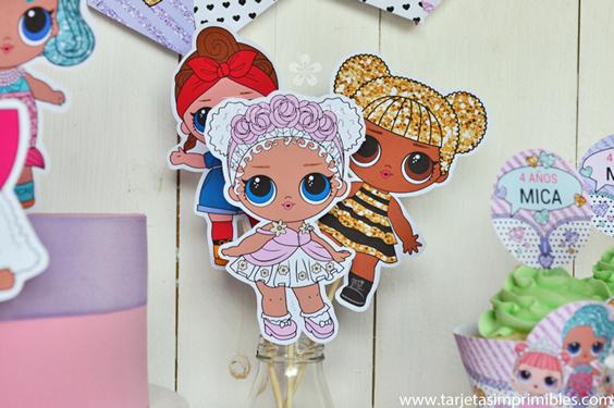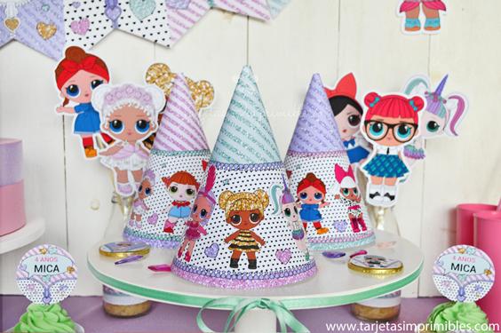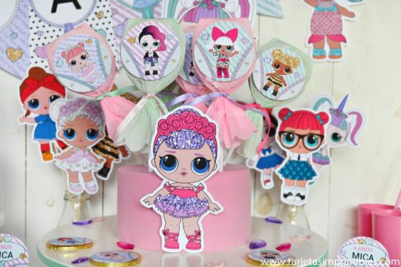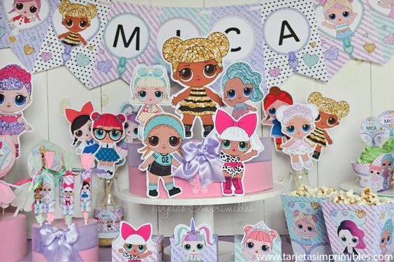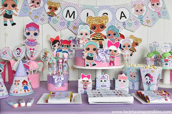 La temática está inspirada en las bonitas y dulces muñequitas LOL Surprise, con muchos colores y brillo para que la fiesta sea deslumbrante y súper original. Podés combinar esta temática con los colores que más te gusten, lo ideal es tomar uno como referencia, por ejemplo el rosa, o violeta, o verde agua, y luego decorar con los imprimibles.