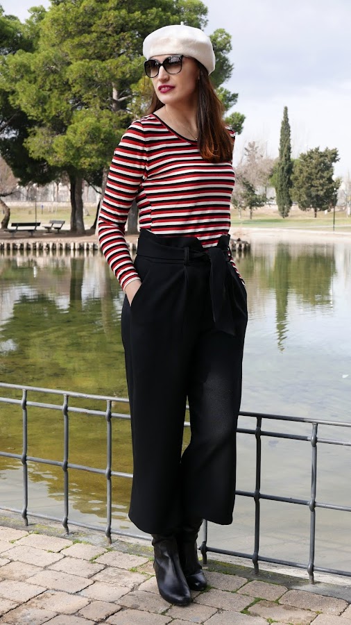 !Hola de nuevo! Aunque no he viajado a París os quiero enseñar el último look que he cosido que tiene un aire francés. Y es que una camiseta de rayas con un pantalón de talle alto y una boina es una mezcla que lleva la mente directamente a la ciudad del Sena