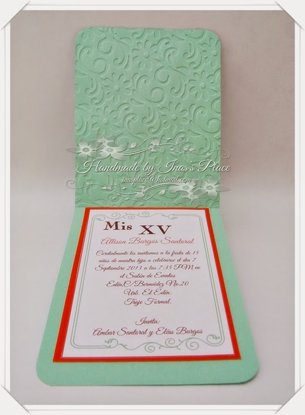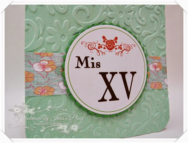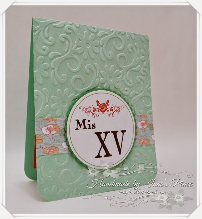 La quinceañera escogió estos tonos y deseaba una florr por lo tanto escogí el papel decorado basada por los colores y el patrón del mismo; la flor le di un toque grunge y el borde lo decoré con punch floreado.