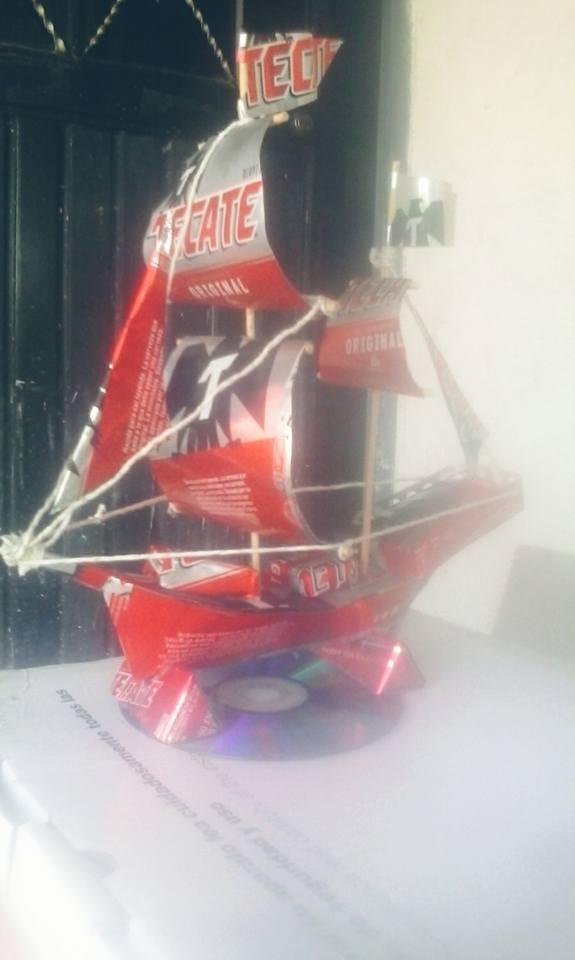 2 María Luisa López Rodríguez- 128 votos. Un barco pirata hecho con varias latas de aluminio.