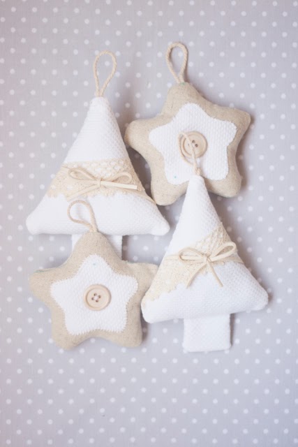 Aprovechando que tenía unos retales por casa en esos tonos y que he recibido hace poco mi nueva máquina de coser, me he decidido a estrenarla haciendo éstos adornos que por cierto quedarán genial en mi árbol!!