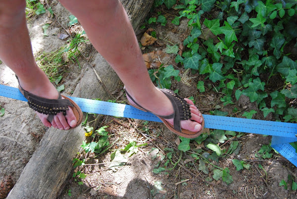 Dos árboles (los cubrimos con una tela para no hacerles marcas), la cinta bien apretada y un montón de horas de tranquilidad para los padres :-). Así pasaron el día los cuatro hasta conseguir recorrerla toda sin tocar el suelo. Fueron probando calzados, con calcetines, descalzos, con una vara de bambú en horizontal... hasta que todos lo consiguieron. Yo por supuesto, no... :-)