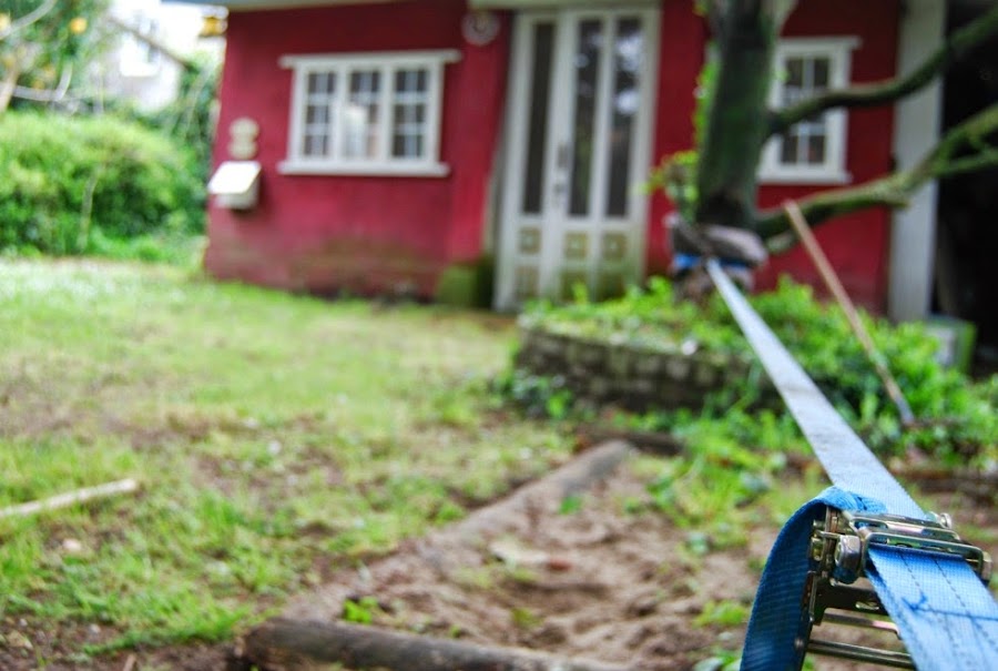 Estas vacaciones tuvimos la oportunidad de recuperar nuestro jardín por unos días y mi padre, de nuevo, nos volvió a sorprender con una de sus ideas. Seguro que últimamente habéis visto en los parques y jardines grupos de jóvenes que atan unas cintas a dos árboles y hacen equilibrios sobre ellas.