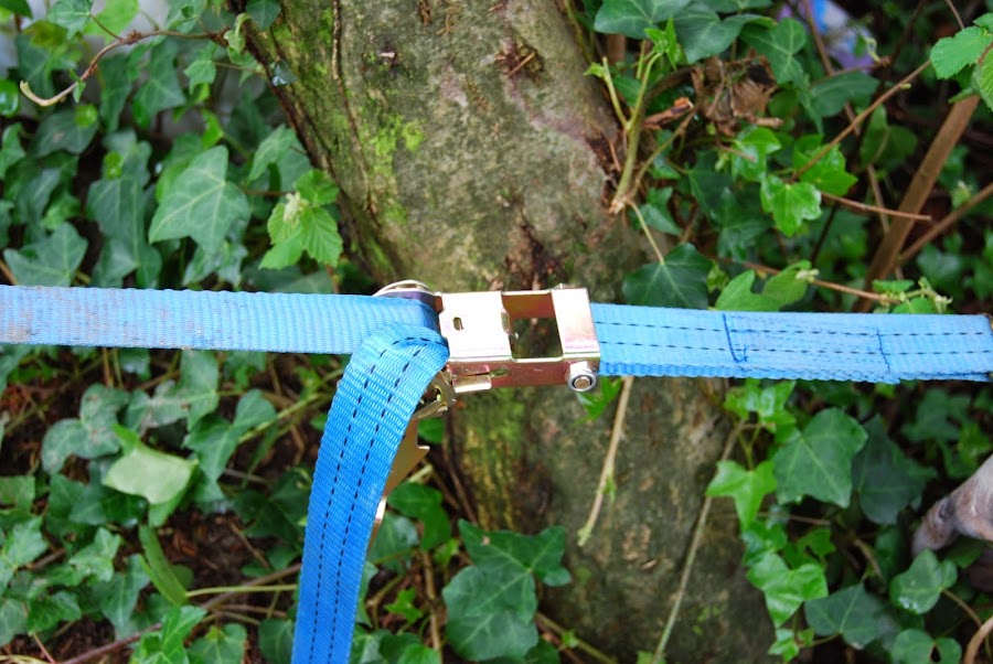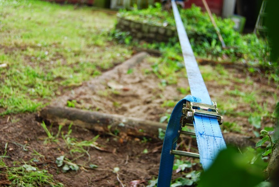 Así que en cuanto llegamos al jardín nos montó una cinta de "equilibrista" con una cinta de camión que parece ser venden en los chinos (lo que no se encuentre allí...). En realidad los equilibristas de verdad utilizan otras más flexibles, pero con una de estas para los niños fue más que suficiente.