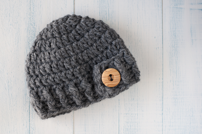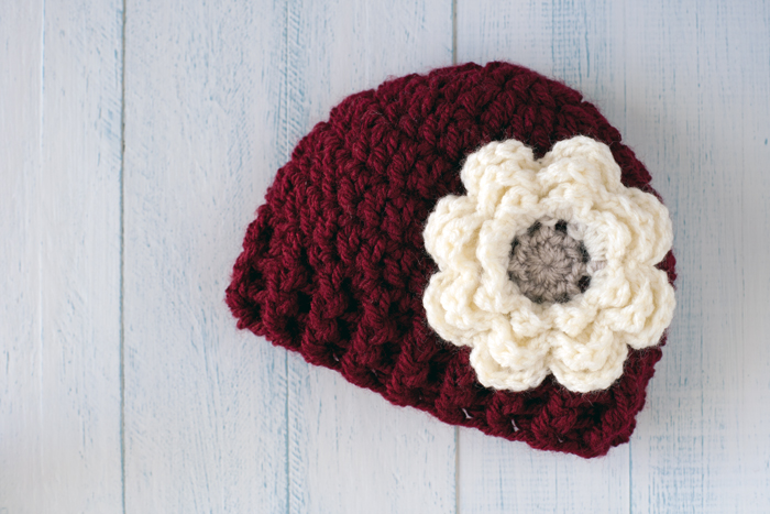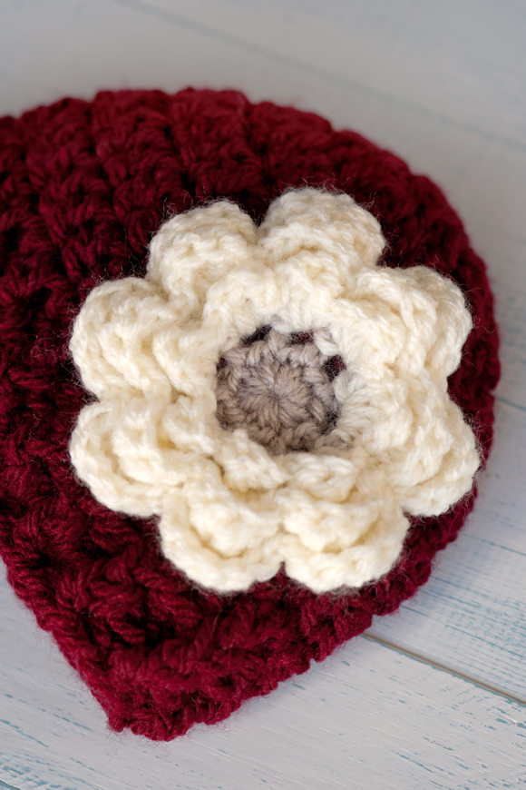 El gorrito para la niña lo hice más sencillo, sin la pestaña del botón, y le tejí una vistosa flor de crochet que contrastara con el granate del gorro. El patrón de esta flor lo podéis encontrar en el blog de Skip to my Lou.