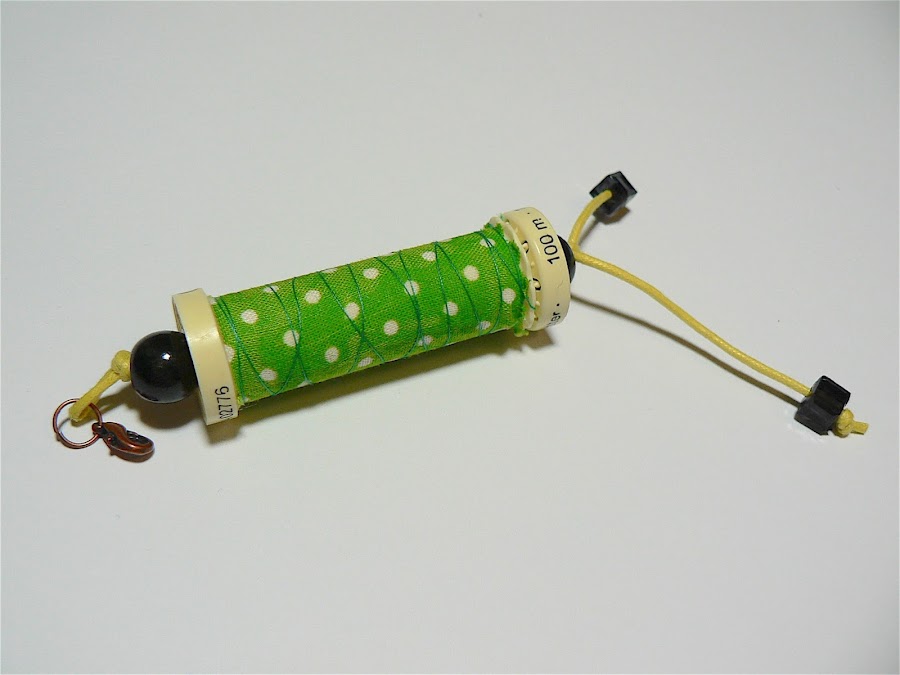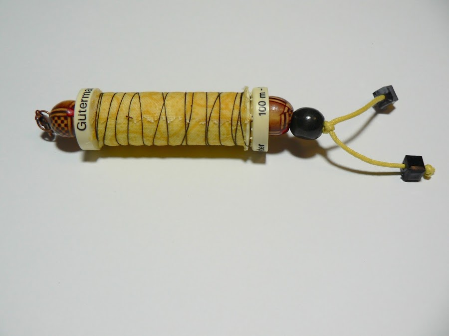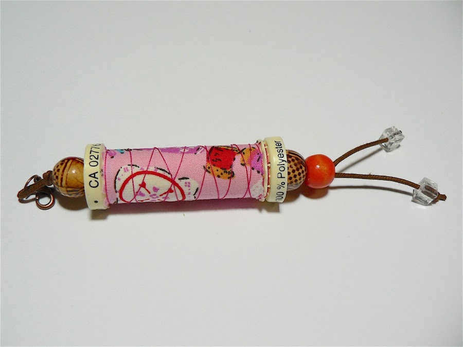Yo los hago con un retal de tela de 6x4cm cortado con la tijera de zig-zag y un trozo de hilo que no mido, simplemente lo enrollo en el carrete sujetando el principio en la hendidura de abajo y dándole vueltas hasta que me gusta el resultado. Después con un cordón y unos abalorios a juego remato la faena. En lugar de ponerle directamente la anilla de llavero me gusta ponerle un mosquetón. De esta manera es más fácil cambiarlo si lo necesitas y también puedes usarlo para otras cosas. Es genial para colgar de un bolso o una mochila.