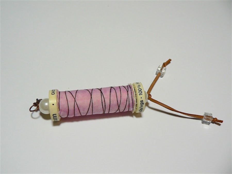 Como apunte, os diré que yo pego con cola blanca la tela al carrete. Me ayudo de un pincel pequeño. Mucha gente tan solo enrolla la tela y la asegura con el hilo. Yo prefiero pegarla, me da mayor sensación de seguridad (no quiero que se desmonte el llavero) y creo que queda mejor.