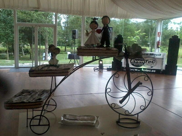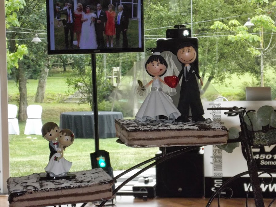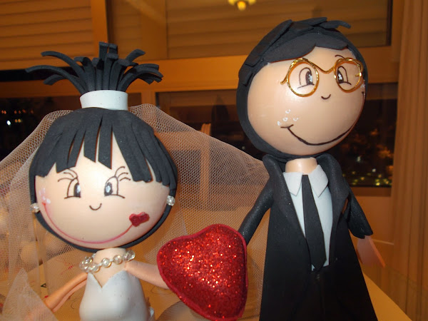 Los uní con el corazón, de corcho forrado de goma Eva con purpurina para darles estabilidad, y en la tarta aguantaron el "tipo" jijiji