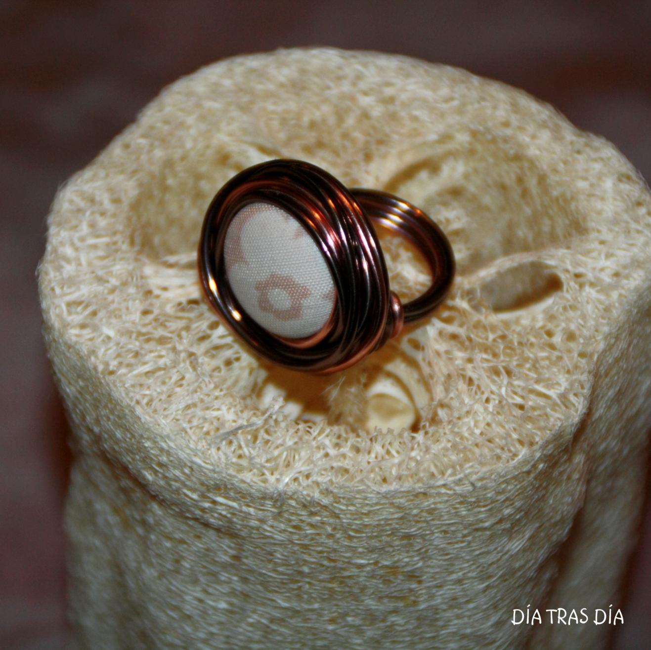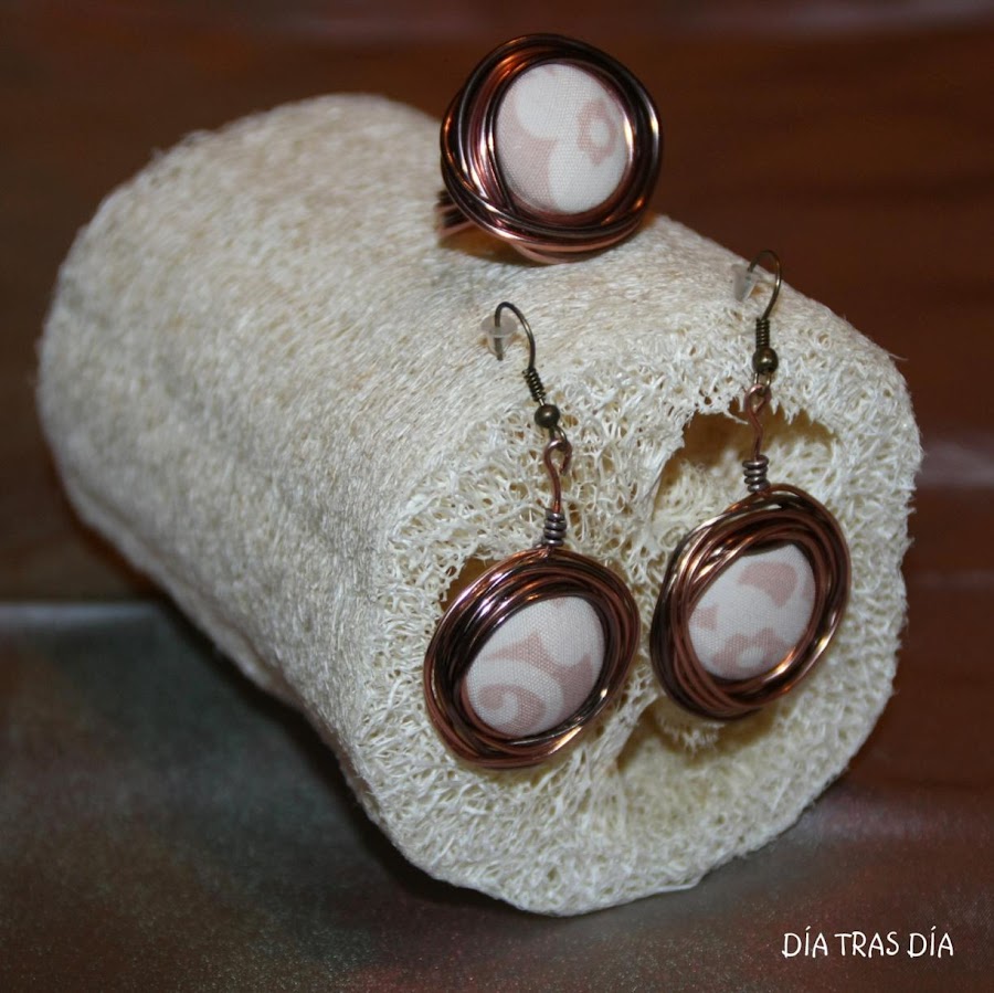 Creo que hasta ahora no había enseñado por aquí ningún complemento realizado con alambre, que es el material que he empleado para su realización, y al que me he aficionado y con el que he estado practicando este verano. Todos los conjuntos que había realizado hasta ahora los había hecho empleando cuentas de distintos colores y formas, pero esta vez, y tomando una idea de un conjunto que se había hecho mi hermana (ver aquí), decidí hacerlo con un botón forrado de la tela del bolso de color rosa y beige. He usado para su realización dos alambres, en tonos cobre y bronce, que le venían perfectamente a la tela y el resultado final ha sido este: