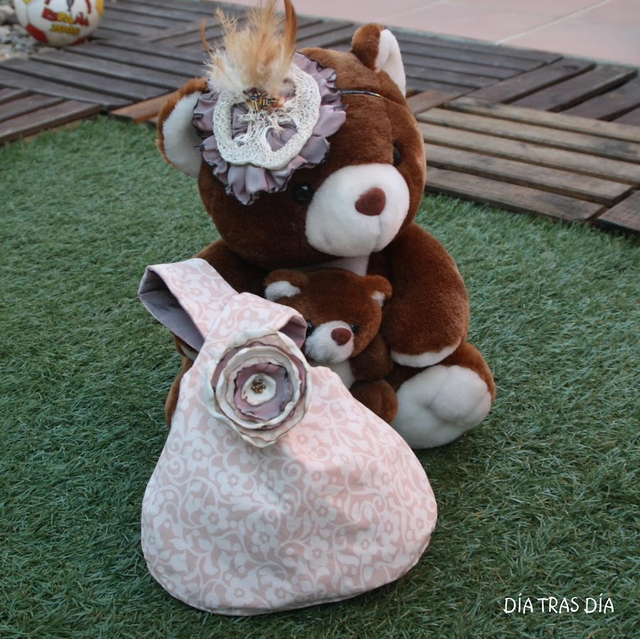Y como adorno, le hice una flor de tela, en la que combiné las dos telas del bolso y un toque en beige, ya que los zapatos iban en este color. Así conseguí que todo quedase totalmente coordinado. Y la flor es en realidad un broche, para que se pueda emplear por ambas caras del bolso o en cualquier otra ocasión como adorno en la solapa, con otro bolso o a preferencia de su dueña.