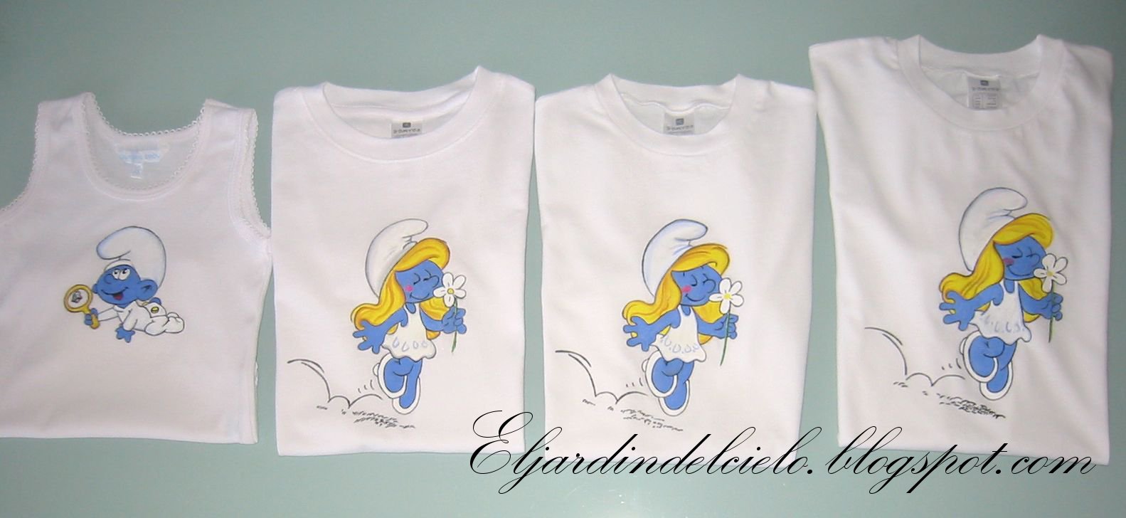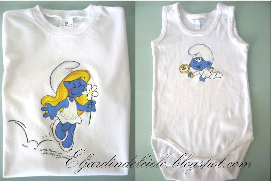 Pese al calor y las pocas ganas, he vuelto a coger los pinceles a ratos por la noche. La otra tarde llevamos a las niñas al cine a ver la película del verano, la de los pitufos y como era de esperar salimos con encargo de camisetas de pitufos, solo que esta vez no han sido dos sino cuatro.