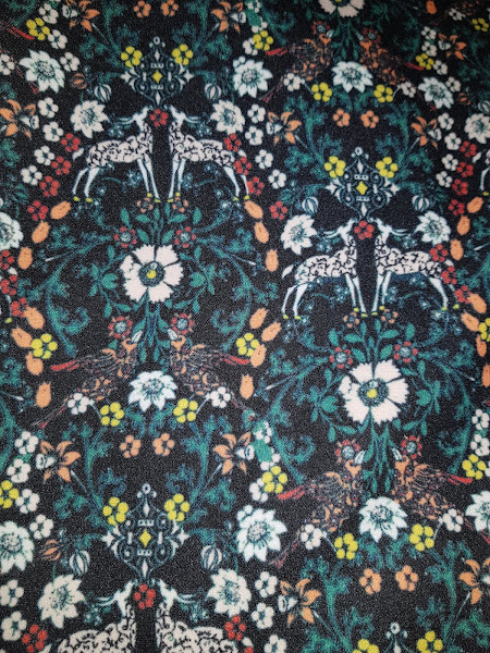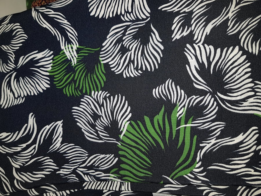 El cuarto tejido es un crep con mucha caida y no se arruga nada , con el fondo negro y dibujo de hojas een blanco y verde , con esta tela me voy ha hacer una blusa.