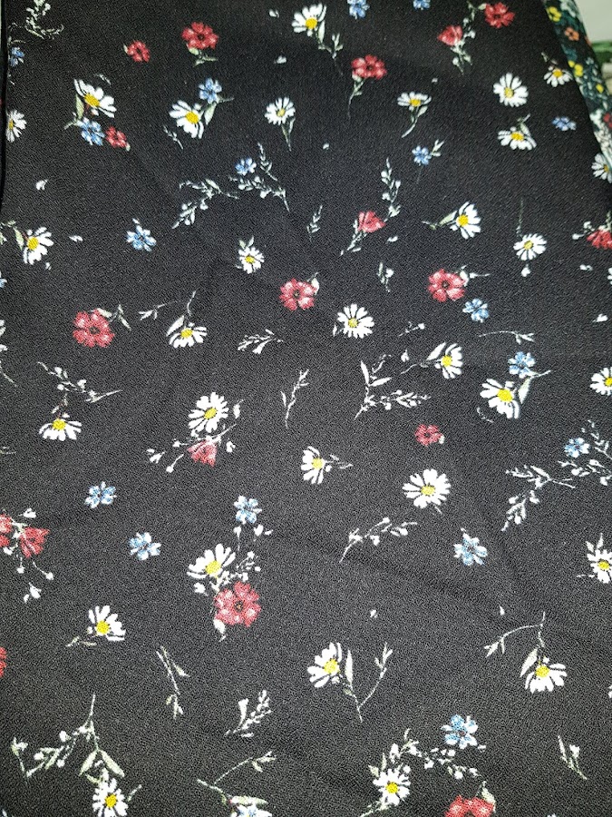 El segundo tejido es un algodon de color negro con florecitas de colores , con esta tela me quiero hacer una blusa aunque tambien estoy pensando en hacer una falda con vuelo.