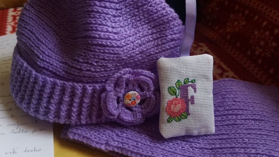 Un saquito con lavanda, y a punto de cruz!!! , es una cucada, con la inicial de mi nombre y en mi color favorito, así como este precioso conjunto de gorrito y cuello, para ir bien abrigadita.