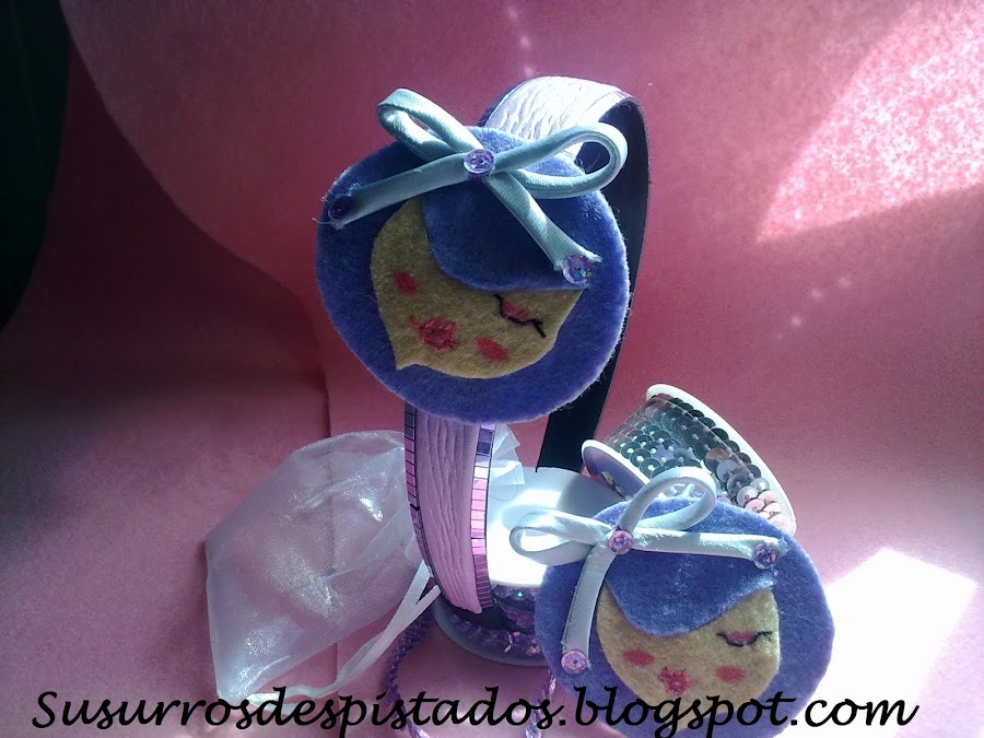 Pues comienzo con un conjunto de diadema y broche realizados con fieltro que vi en internet y me encantaron. Como iban destinados para un conjunto en color malva y blanco, quedaron que ni pintados.