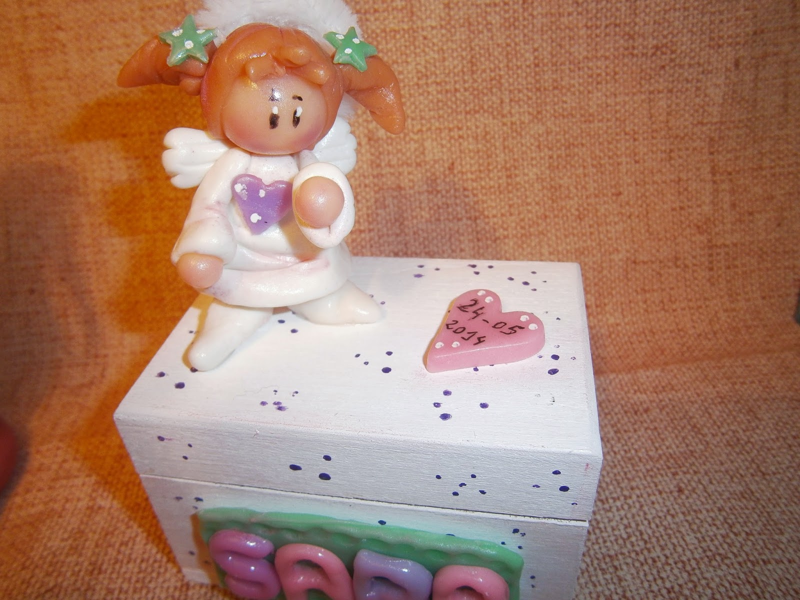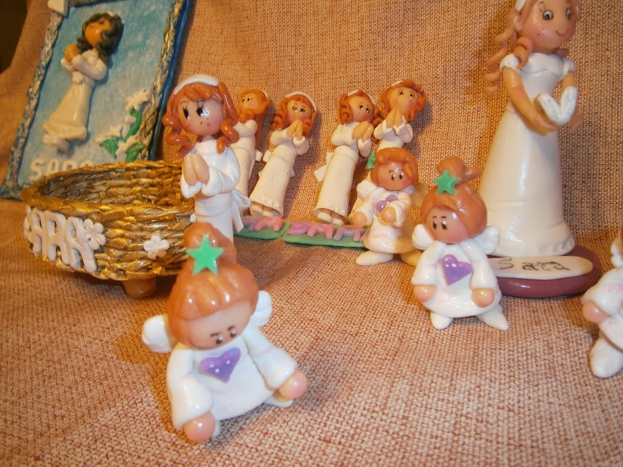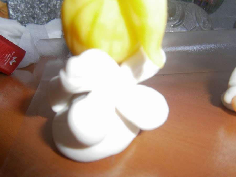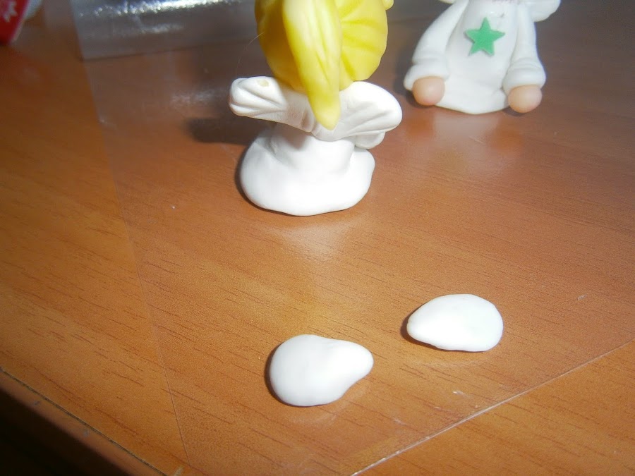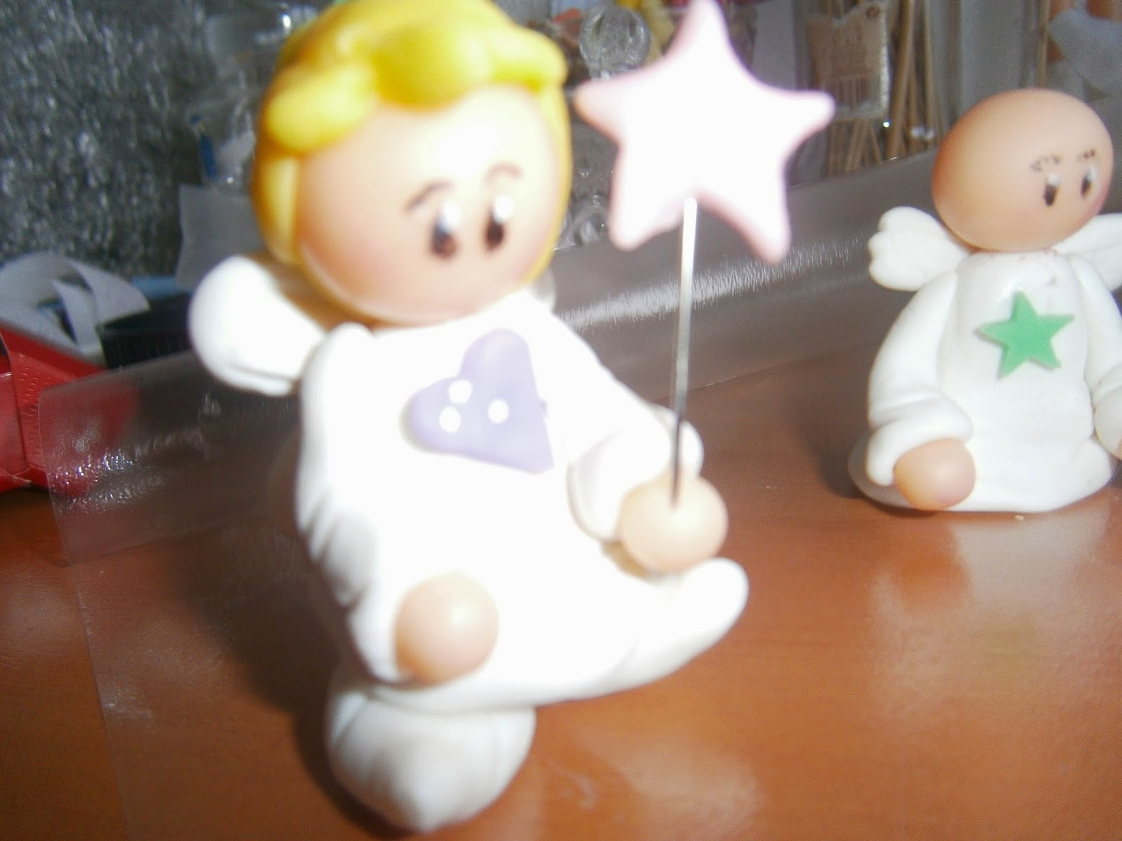Como veis éste es el famoso angelito, para convertir nuestro muñequito en ángel solo se necesita modelar dos bolitas en forma de gota para las alas, la aureola esta hecha con círculo de un limpiapipas, una vez modelado el muñequito siguiendo los pasos del primer tutorial, pega a la espalda la aureola sobre ella pega las alas que en el caso del ángel sólo lleva dos, y listo